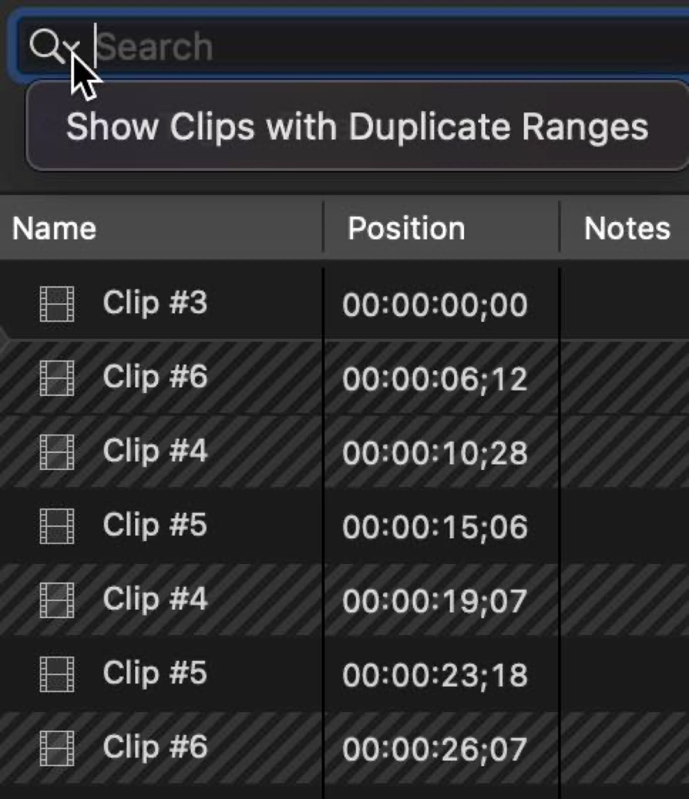 The duplicate clips also appear in the Timeline Index with hash lines. By clicking on the triangle next to the search magnifying glass you can limit the index to displaying only the duplicates.