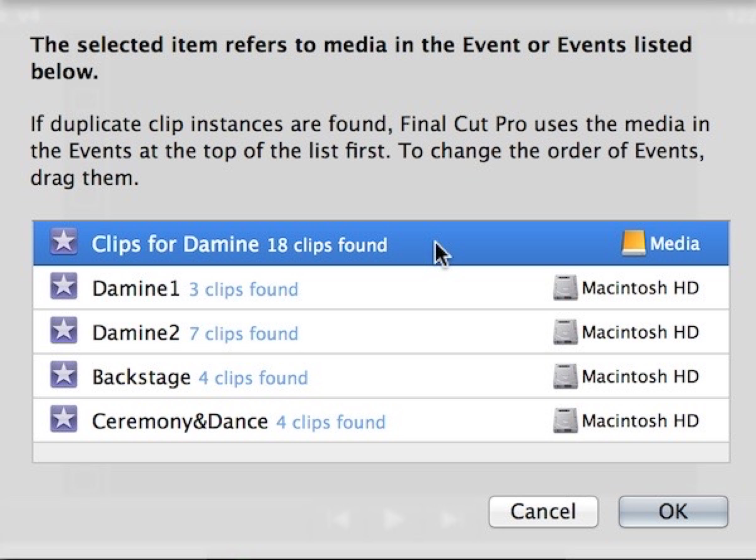 To change the referenced events, click the Modify Event References button. A dialog appears that shows you where all the media used by the project is located, including duplicate media in duplicate events. In the dialog drag the master event you want the media to reference to the top of the list.
