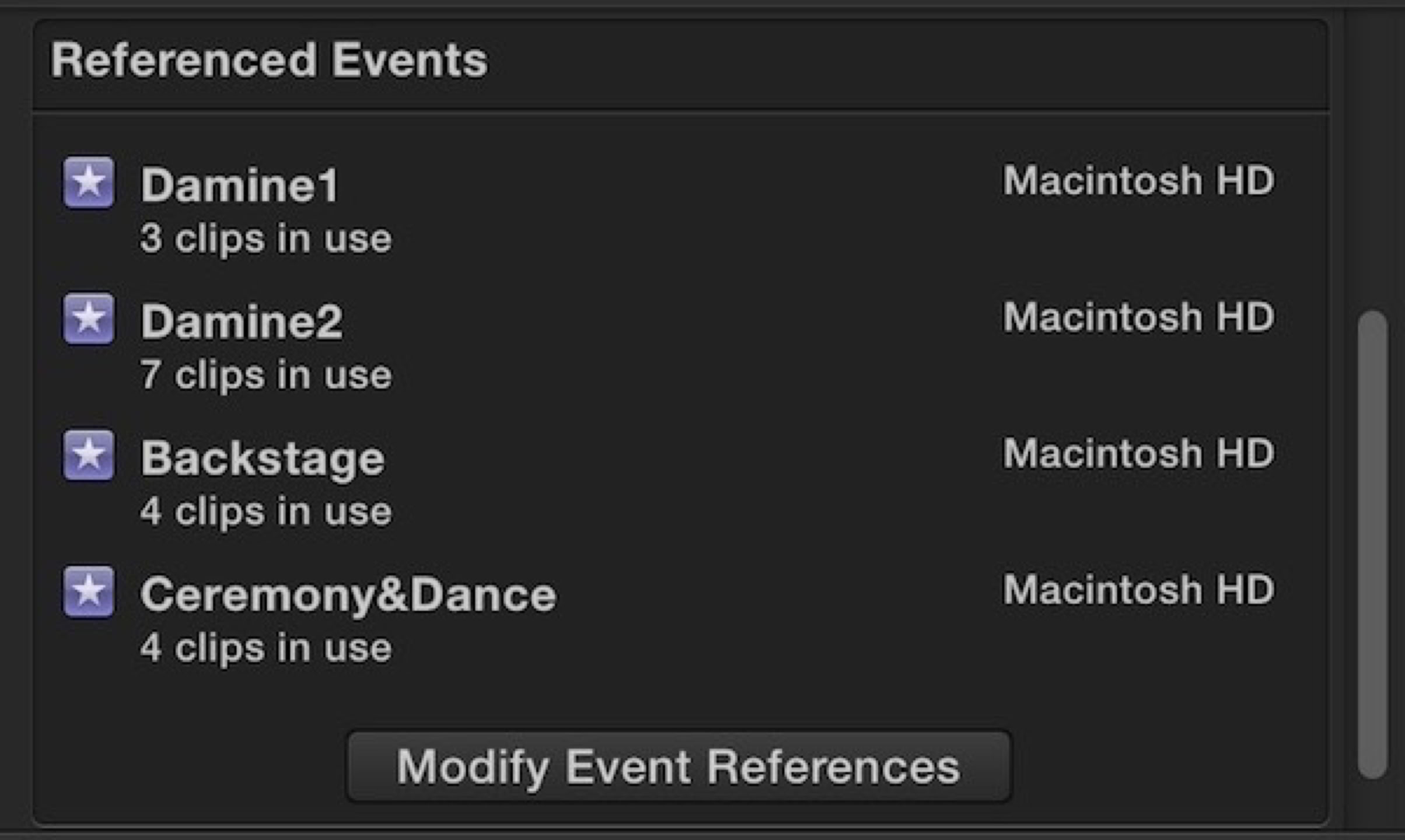 The next step is to point each of the projects to the new master event that has all the used clips and only the used clips. Select each project, one at a time, and open the Properties inspector (Cmd-4). At the bottom of the Properties inspector is a display that shows which events are referenced. You want to point all the projects to the duplicated event.