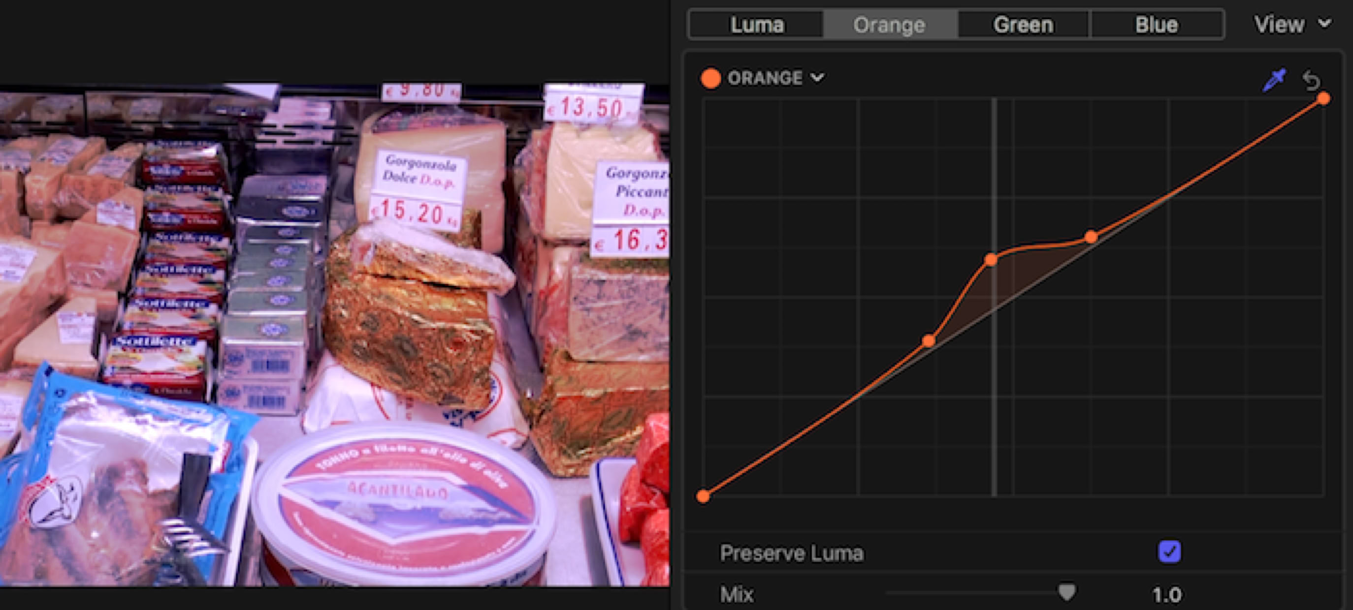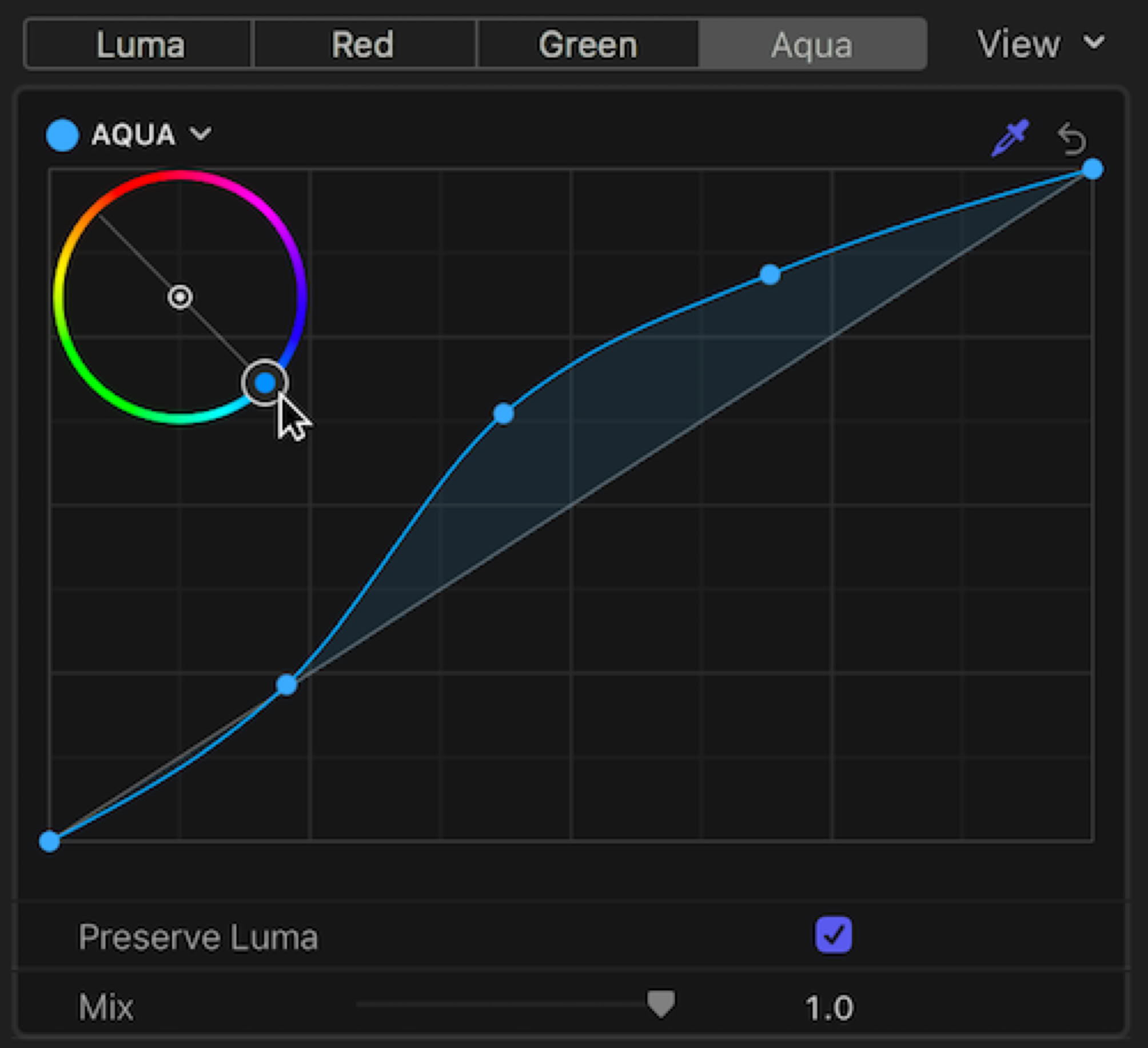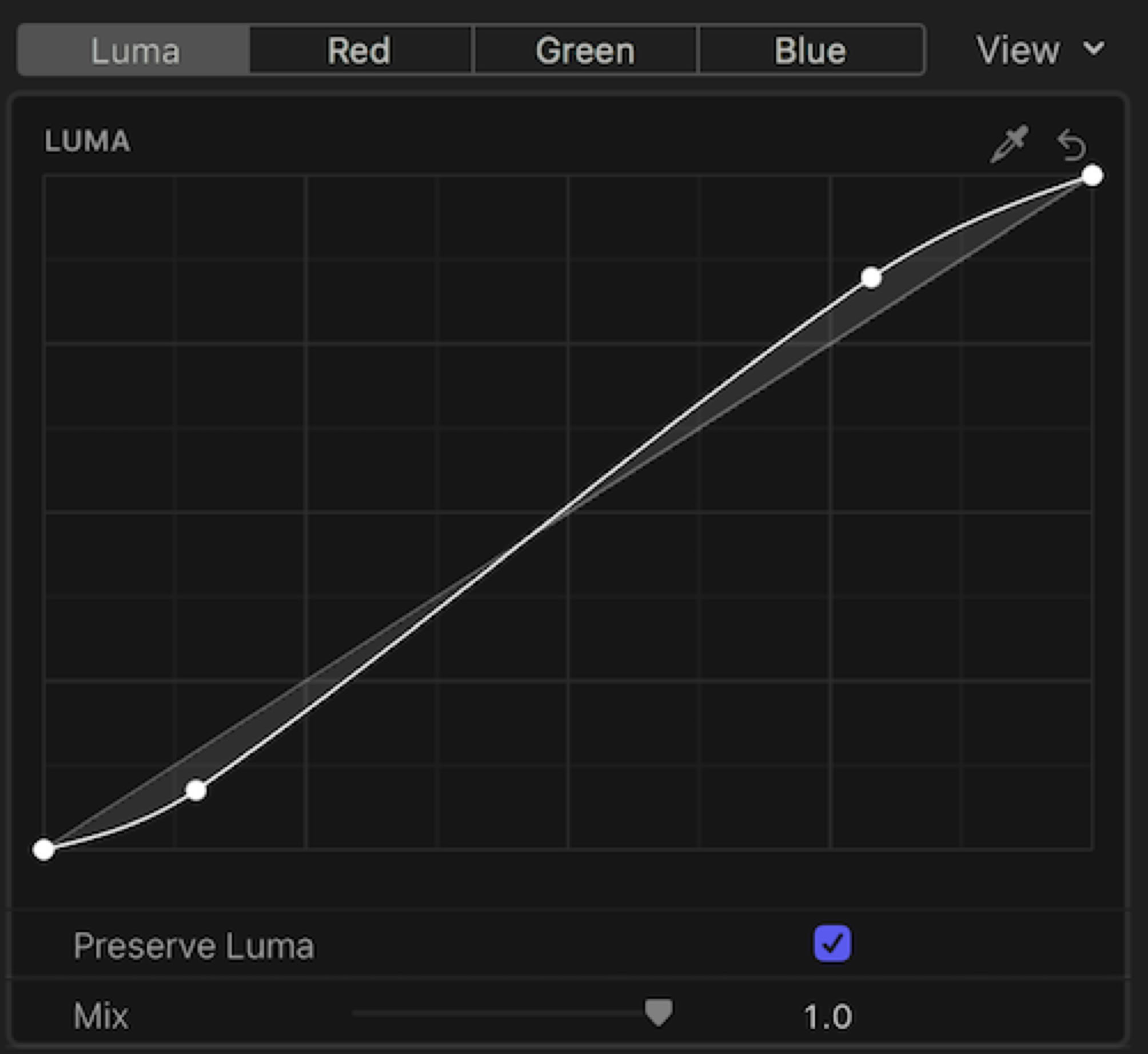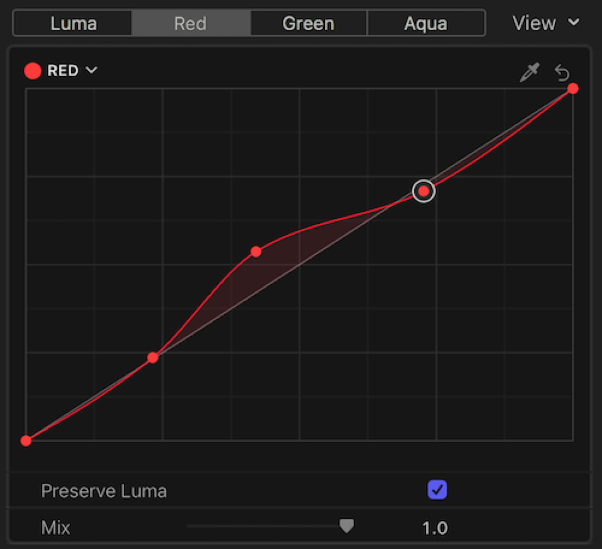 Like the Color Wheels, the four curves can be collapsed into a single line with buttons to select between them. Also, notice the Mix slider and the important Preserve Luma checkbox, which is on by default.