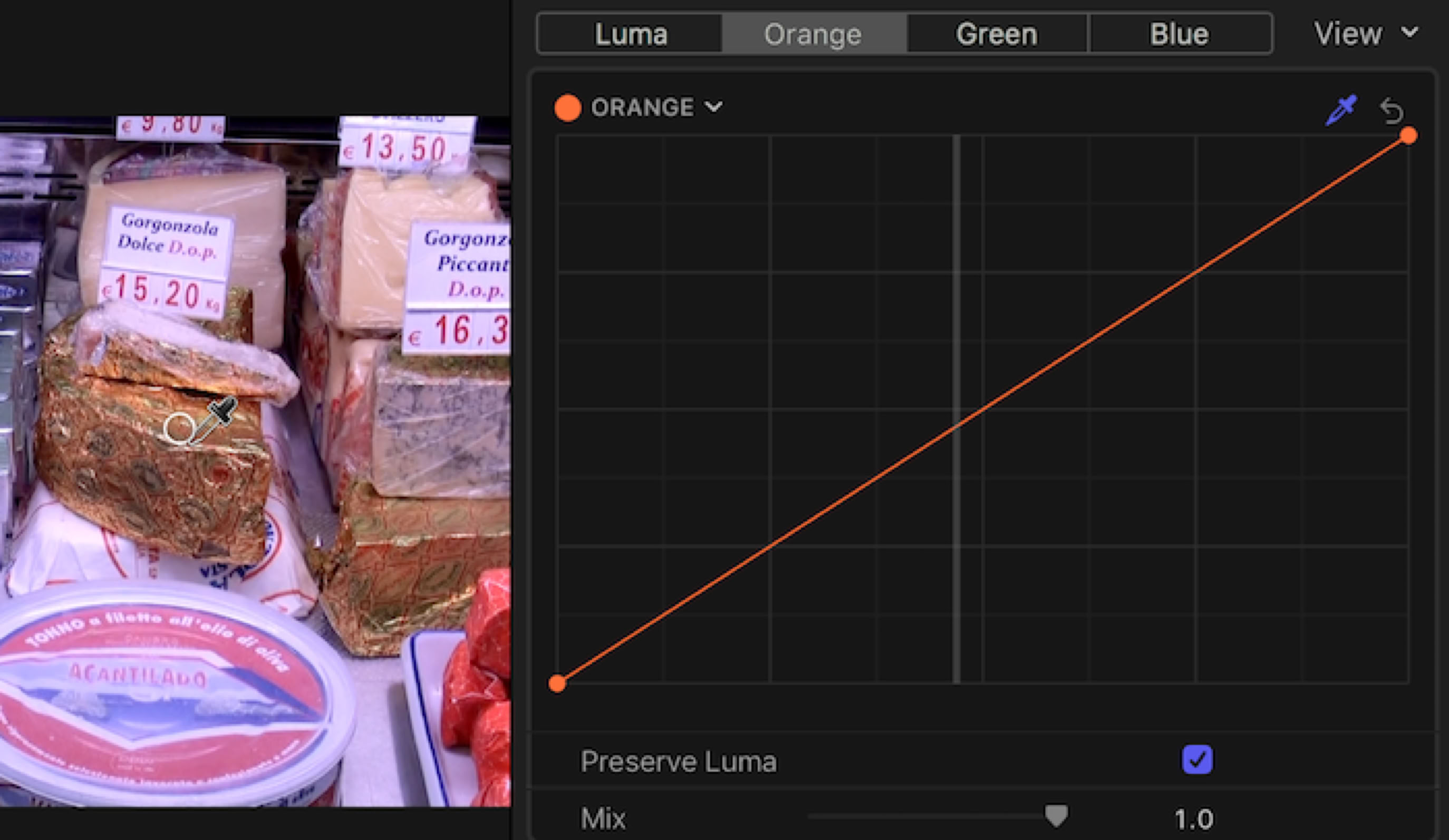 Make a selection with the eyedropper in the Viewer, and the curve will change to the appropriate color, here changing Red to Orange, and indicating the selection point on the curve.