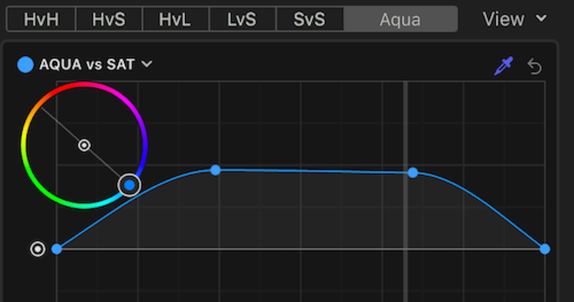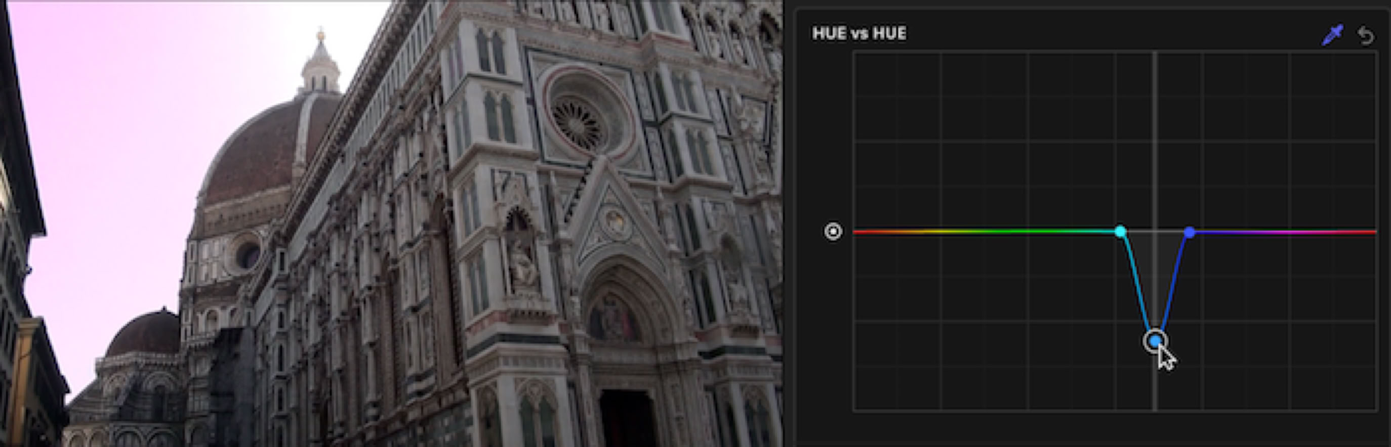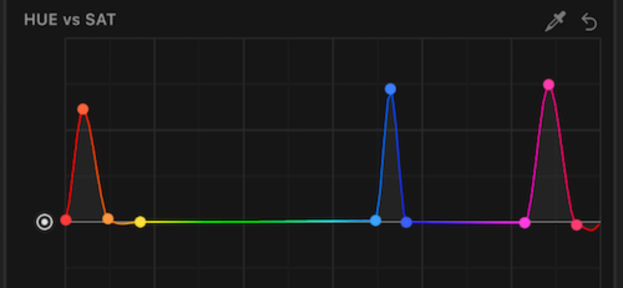 HvL, Hue vs Luma, lets you raise or lower the luminance value of a color range without affecting the saturation. This can be useful if specific colors are overly bright and are looking washed out. If you’re working with a narrow band and want to keep the points pinned at a certain level, holding the Shift key will let you drag a point constraining it to move only horizontally.