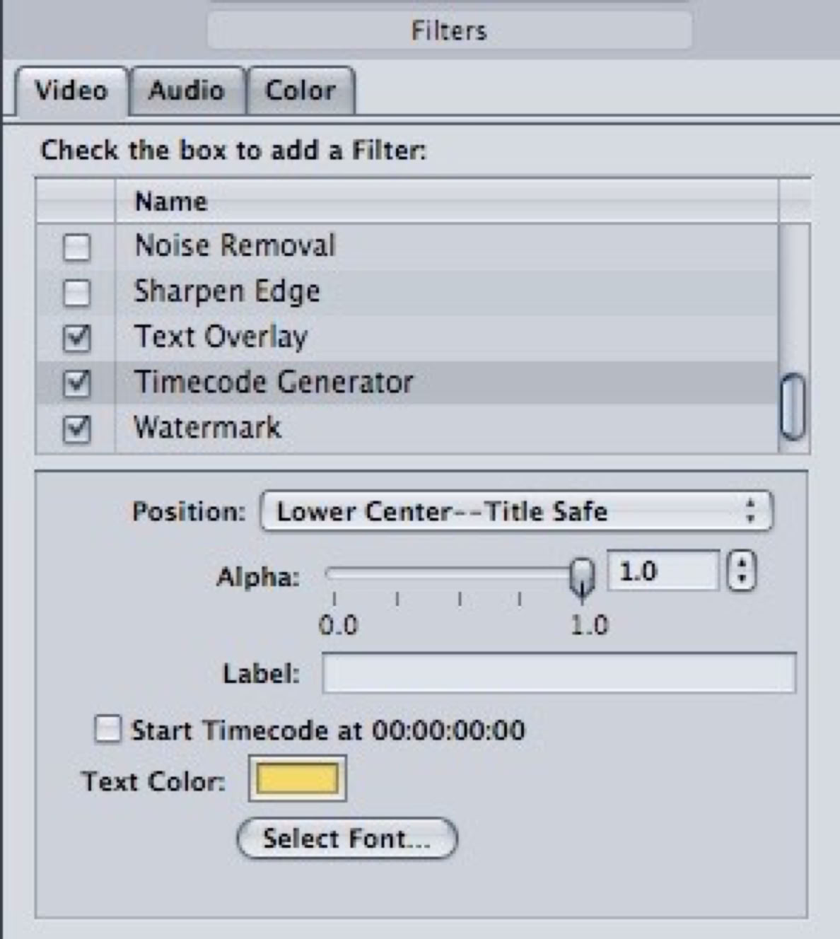 Text Overlay lets you add text over your video like NOT FOR DISTRIBUTION or something like that. Timecode lets you add timecode in any of the standard locations and will either start the TC burn at zero or will read the timecode from the file that’s being encoded. These are the handiest ways to add these elements rather than overlaying them in FCP itself.
