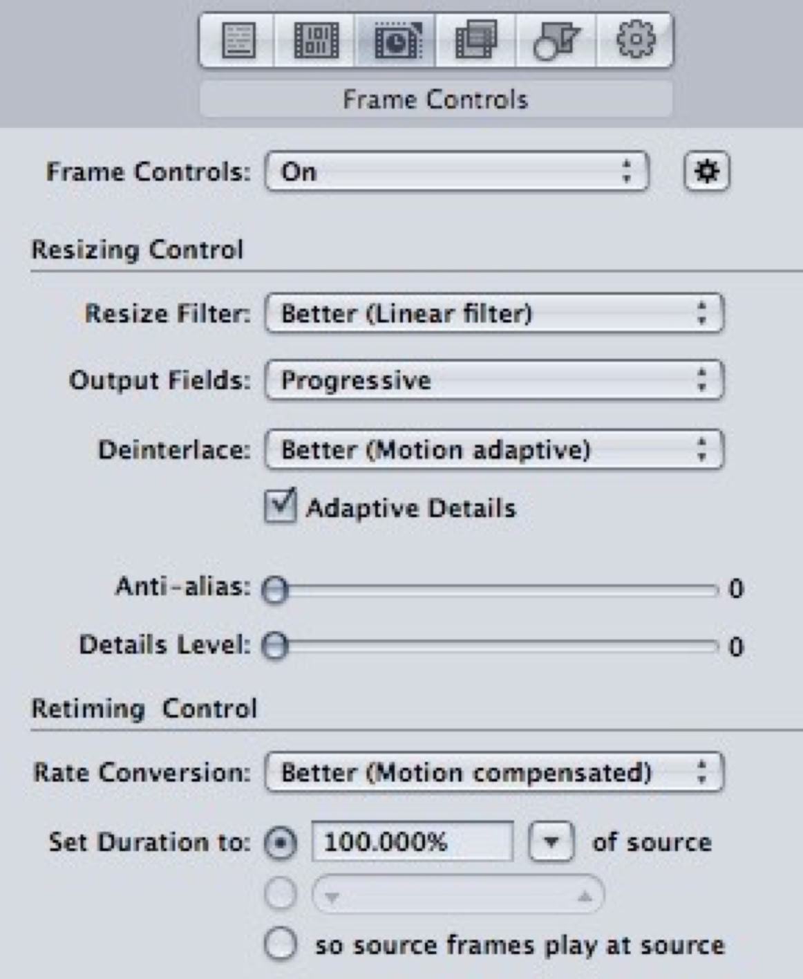 For all interlaced video that is to be seen on a computer, you want to make sure the material is deinterlaced. If the original material is interlaced, set Output Fields to Progressive and Deinterlace to Better (Motion adaptive). Don’t use Best; it’s actually not as good as Better. Also uncheck Adaptive Details. Reducing the frame rate will also help reduce the file size. For projects with very little motion, like talking heads, this can be very useful. If you’re going to change the frame rate of your output, in the Retiming controls set Rate Conversion to Better (Motion compensated).