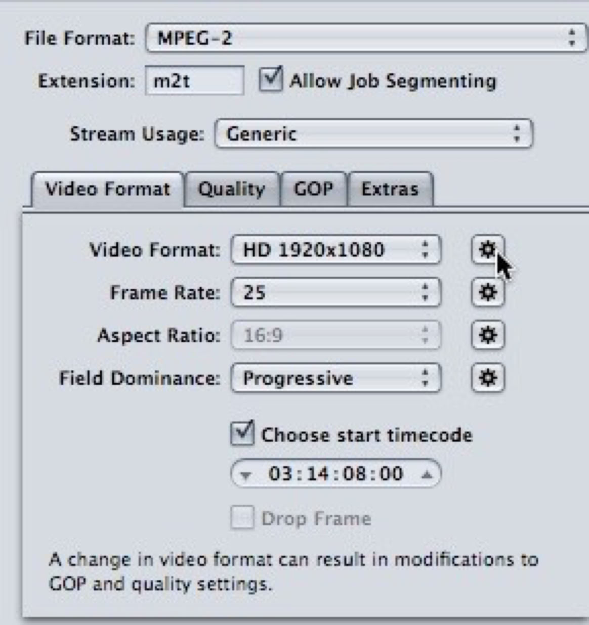 In Video Format the default is on all automatic, which is fine for most things. If you need to alter the format, click on the gear button and the pop-up next to it will become active. Notice the checkbox that allows you set the start timecode.