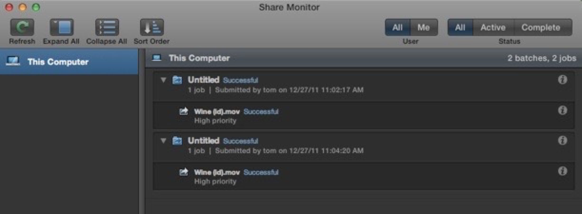 The Share Monitor allows you to selectively view various encoding or completed batch processes. The little i button at the end of the job name opens a popup with more information. You don’t need to open the Share Monitor, though it can be helpful. Much of the information is also available in Compressor in the History window.