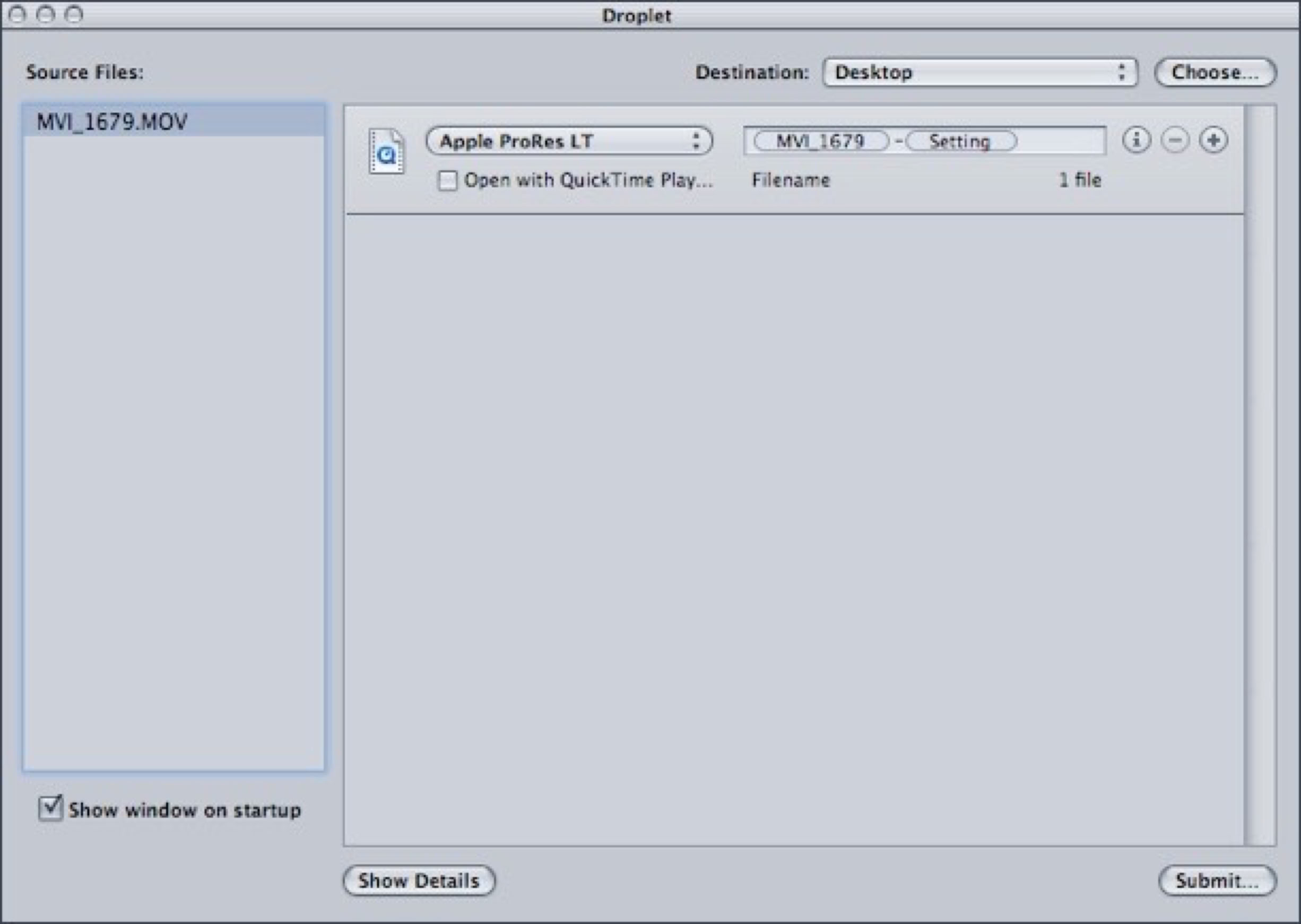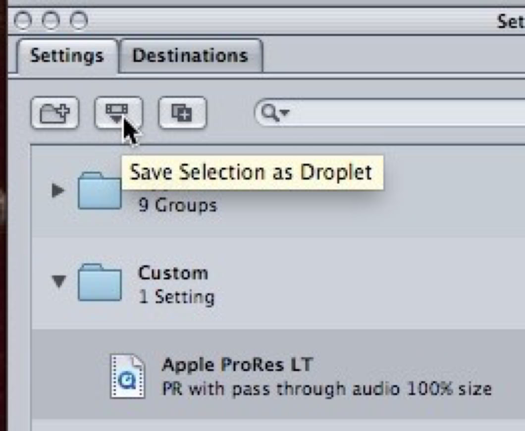 A Droplet is a tiny application that lets you apply a compression setting to a media file. You can put the Droplet anywhere you want. Usually you just leave it sitting on your desktop. You can make any preset, Apple or custom, into a droplet. Simply select it and click the Droplet button in the Settings tab.