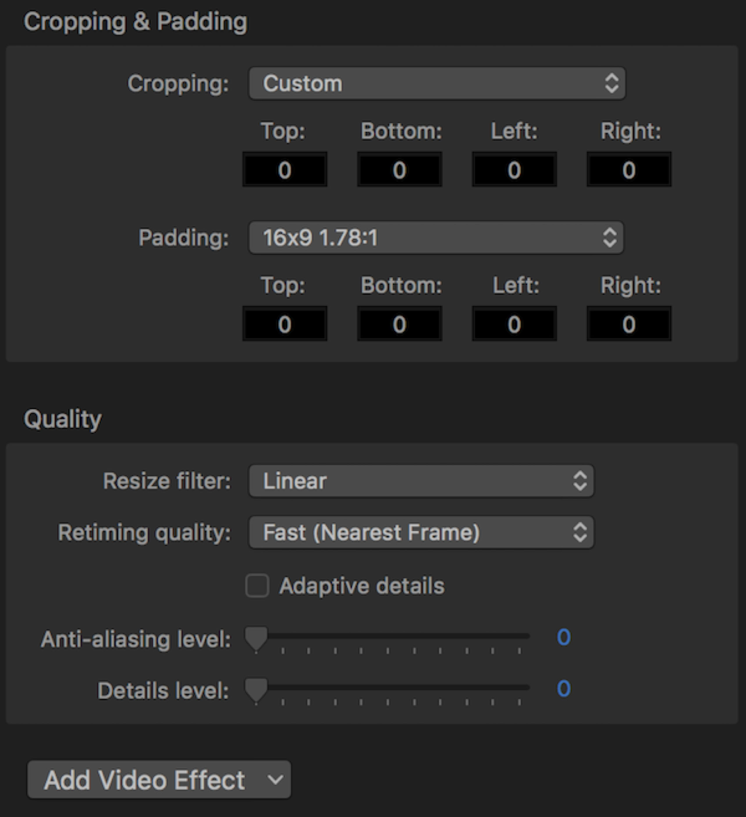 In the Quality section you can change the Resize filtering, which defaults to Better and is fine for anything that’s being scaled down, saying from 1080 to 720. You might want to set this to Best if you’re having to scale up your output. If you're retiming you can set it to Better, don’t use Best, it’s very slow and not of great benefit, unless your video is full of fast pans. Leave Adaptive details off. Anti-aliasing will soften the image slightly, and Detail will sharpen it slightly. You might use Anti-aliasing is you have a lot of text that is showing artifacting, and you might use Detail if your video is made up of a lot of high resolution still images.