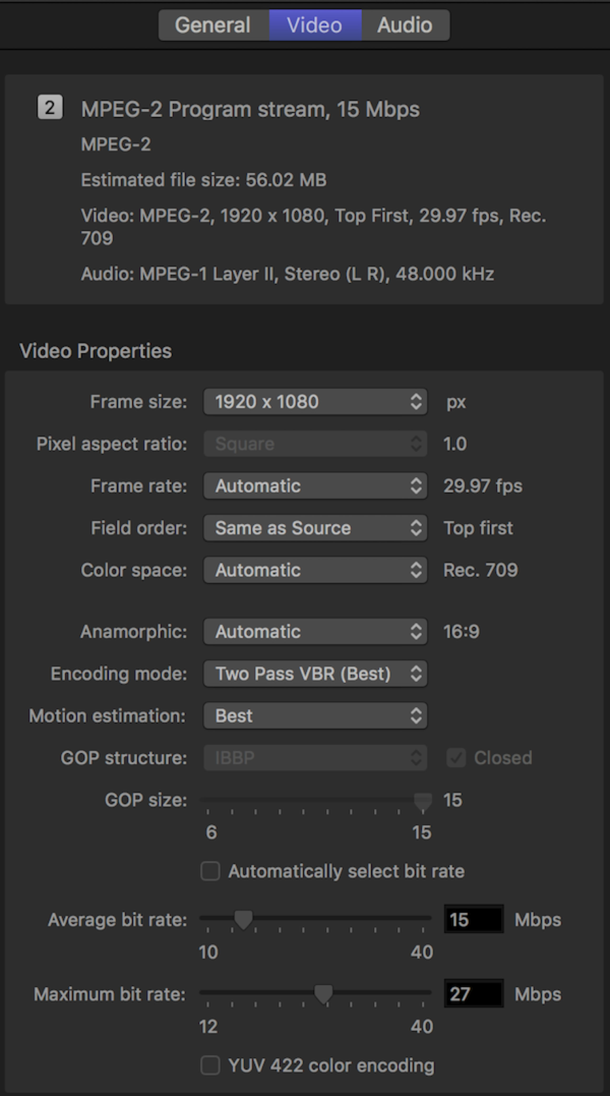 While previous versions of Compressor had six tabs in the Inspector, 4.1 and later have only three panes. The first pane is the General pane, which we saw earlier. This gives you some basic information about the setting, including the file extension, lets you name it and tells you its data rate is 15 Mbps with an estimated file size that’s 6.92 GB for one hour of video. Notice the checkbox for job segmenting, which allows you to distribute the processing across multiple machines on a network. It will also segment on a single machine, but has no real benefit.