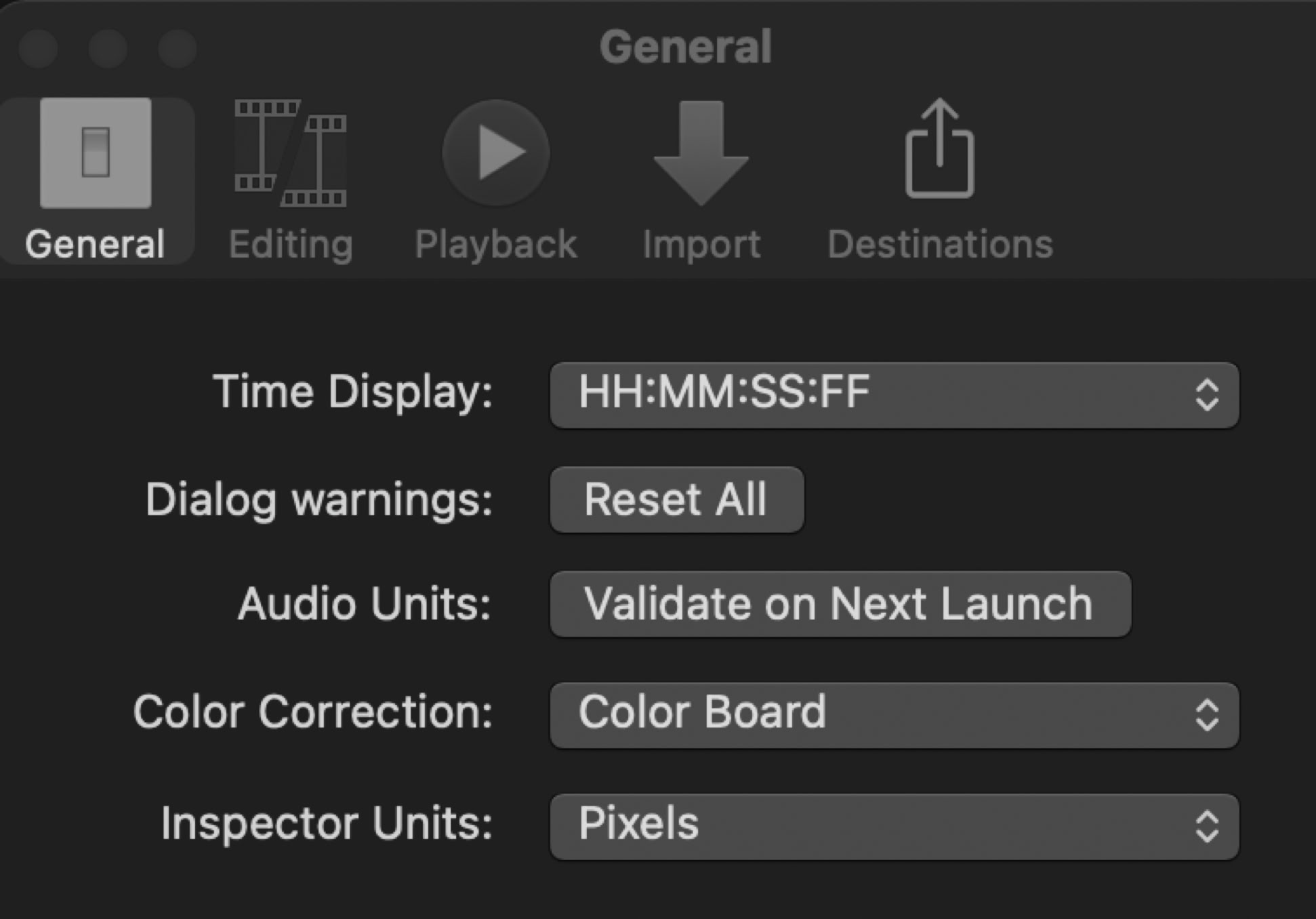 If you’ve come to FCPX from other video editing applications, one think that will strike you about the FCP preferences is how minimalist they are. Clearly there was a deliberate effort made to simplify this from the original 17 panels of preferences that were in legacy FCP. They might have gone a bit too far in their zeal, and there are probably some preferences that should be there, and others that perhaps should be different, but I guess that’s why they’re called preferences. So let’s look at the panels. To access preferences open them from the Final Cut Pro menu or use the shortcut Command-comma, which has become the standard in pretty much all Mac applications.
