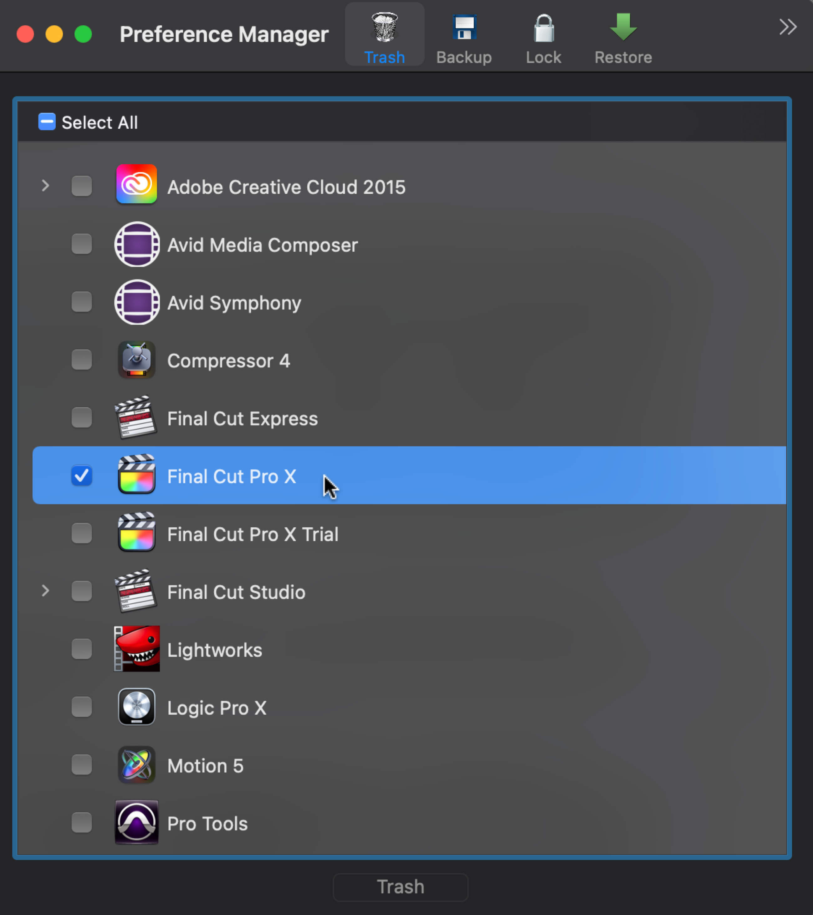 This actually does move the preferences files from your home Library to the system trash. When you reopen the application the preferences get rebuilt to their default state. Preference Manager, as you can see, works with many different video applications including Compressor, Motion, and Adobe applications. A great advantage of Preference Manager is that, in addition to trashing your preferences, it allows you to backup and restore your preferences. Once you have them set the way you like, you can back them up to save them, and then you can restore them to bring back those 17 panels of FCP7 prefs exactly the way you set them up.