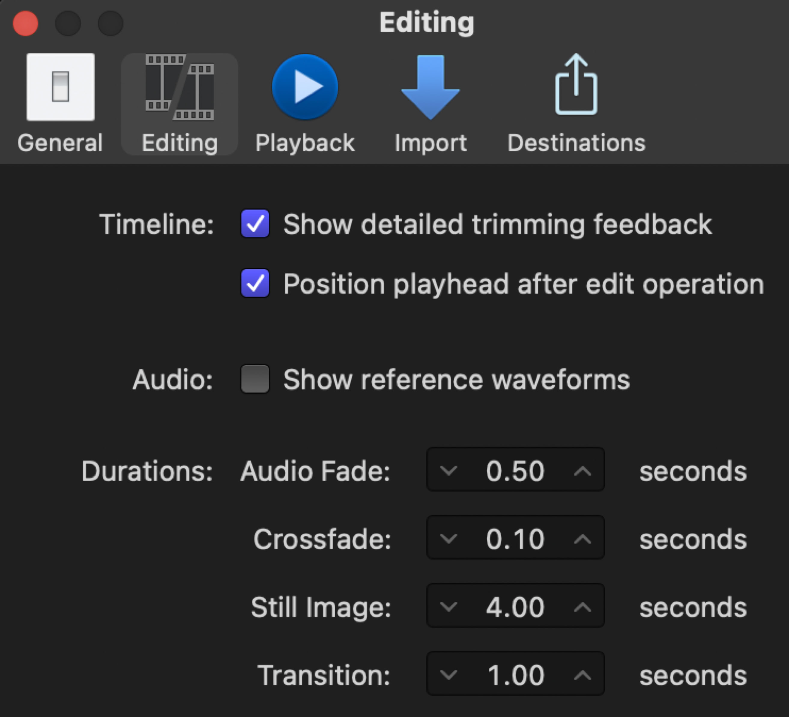 Still image duration defaults to four seconds and is another source of confusion. This is not the import duration of a still image. This is the selection duration. The import duration is always 10 seconds. When you click on a still in the Browser the selection that’s made is four seconds, or whatever preference you’ve set.