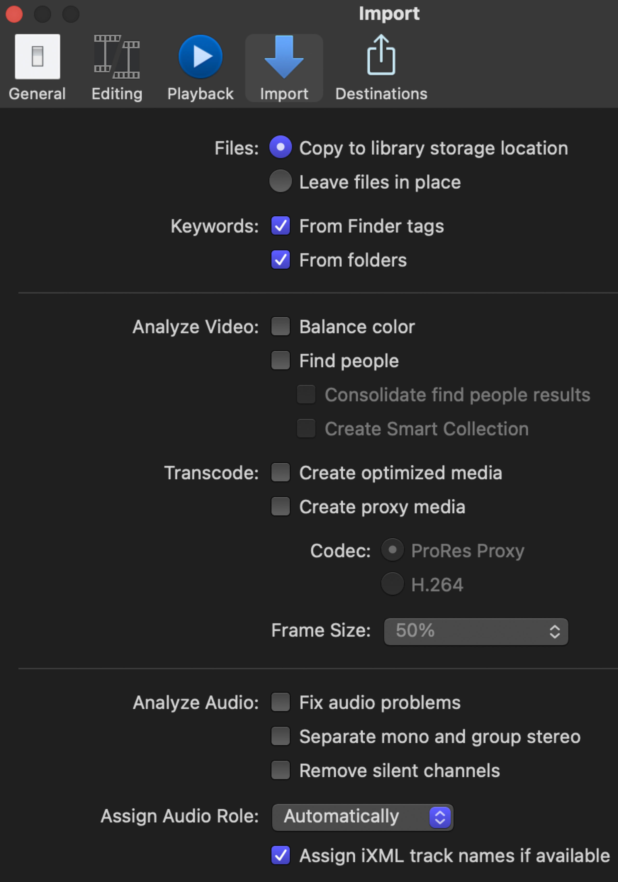 I usually leave this in its default state. Anything in here can be changed in the right hand sidebar in the Import window. I want to put everything I work with either into the library, or more often into a designated media folder. I don’t like leave in place because then content can get scattered all over the place. Remember in recent OSs if there a duplicates of the same file on a drive, it doesn’t use more space, there’s only a single instance of the file, which disappears only after it’s been trashed for all locations. It’s confusing sometimes when the folders on the drive add to to more space than the drive can actually hold.