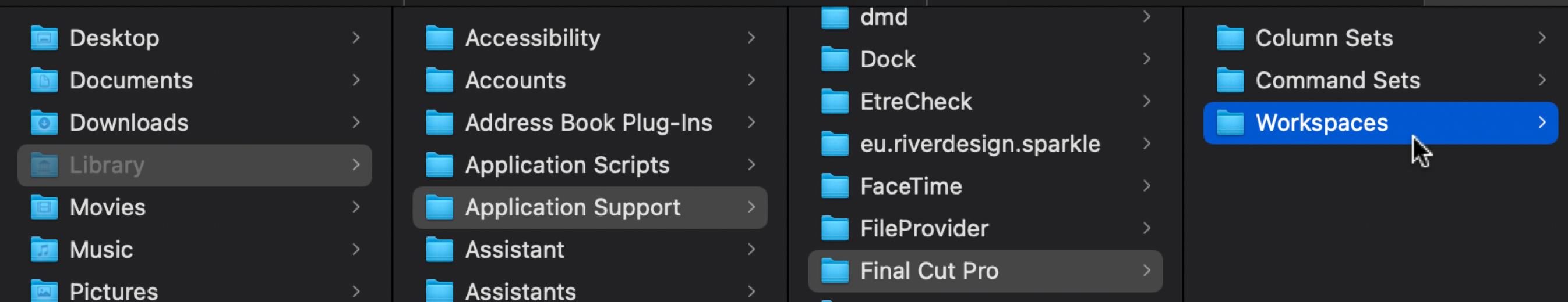 Related to resetting your preferences is a problem that sometimes occurs with window layouts. Occasionally the launch process with Option-Command will stall on the FCP splash screen while it’s displaying Restoring window layout. When this happens the first thing to try is delete your window layouts so they reset. They are stored in your home Library. To access the Library folder from the Finder, hold the Option key and select it in the Go menu. Then go to Library/Application Support/Final Cut Pro/Workspaces.