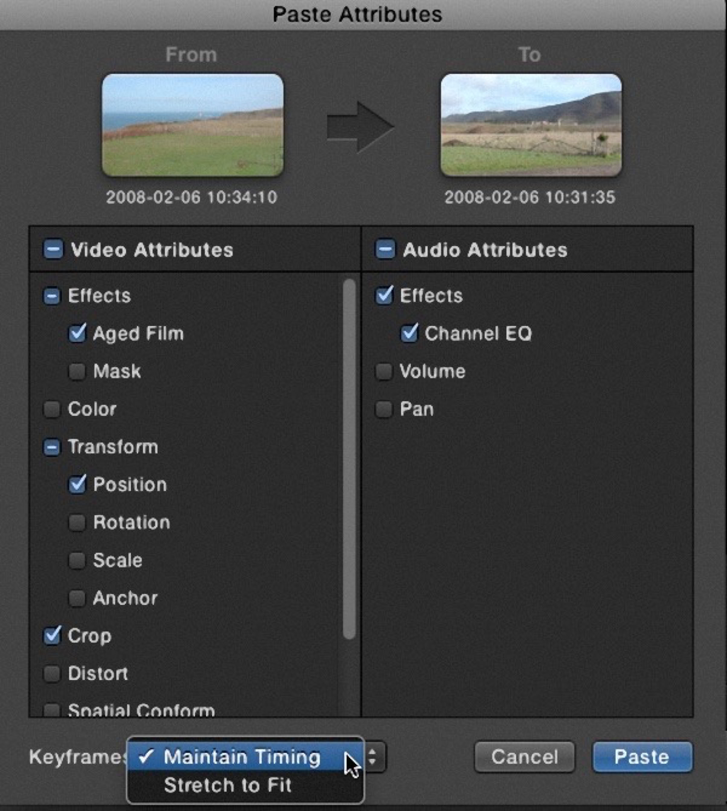 At the top of the dialog the display tells you what clip you’re copying from and what clip or how many clips you’re pasting to. You can paste effects individually as well as pasting color corrections and transformations individually. Spatial conforms and composting settings can be paste, and of course audio settings for volume, panning, and individual audio effects. This interface will also allow you to copy and paste keyframed parameters, either maintaining the current keyframe timing, or stretching to fit the duration of the new clip from the popup at the bottom of the dialog.