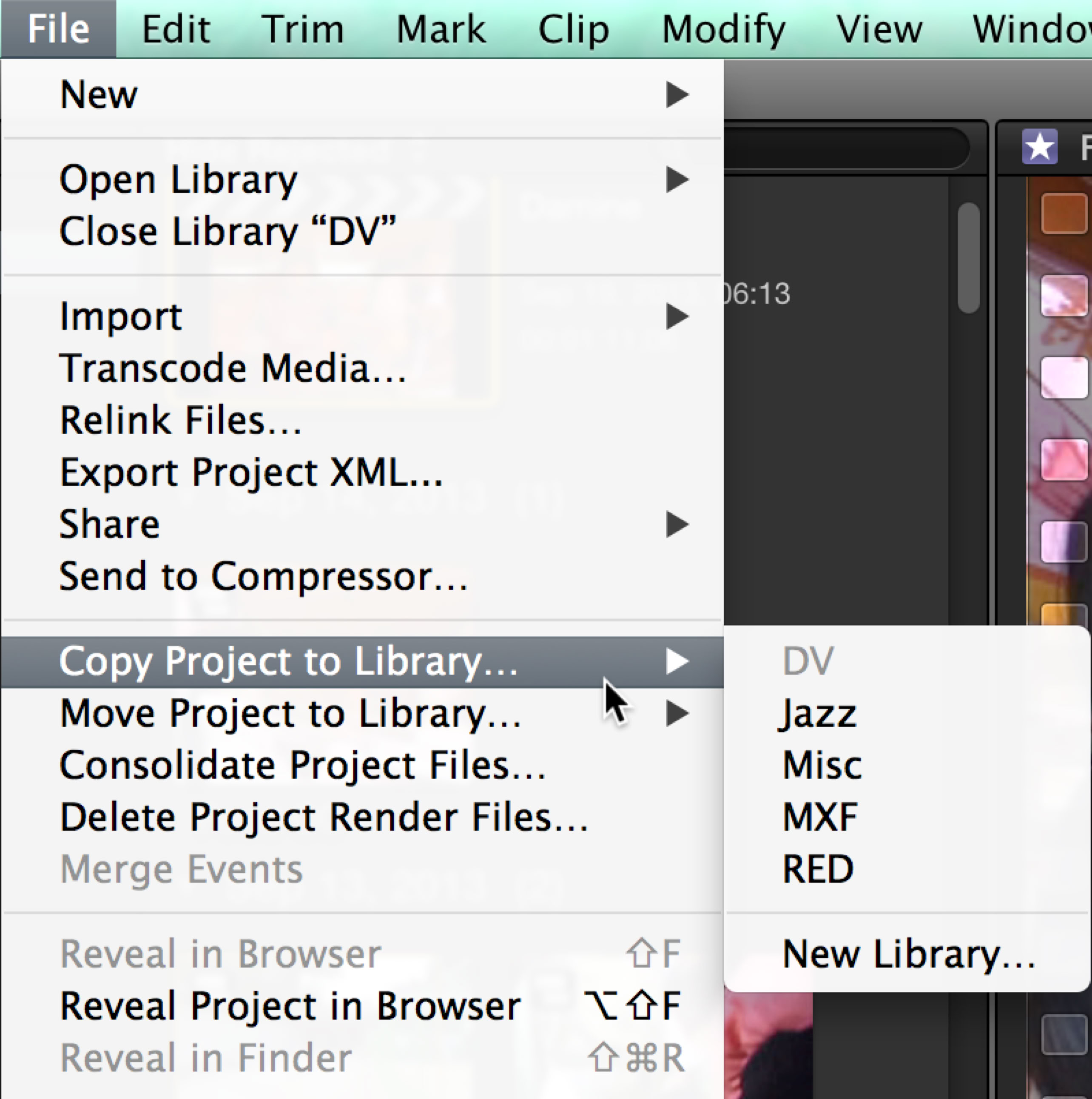 You can copy a project to another library or move a project to another library. Because the media for a project has to be in the same library, the media used in the project will be copied to a new event in the selected library or into a new library.