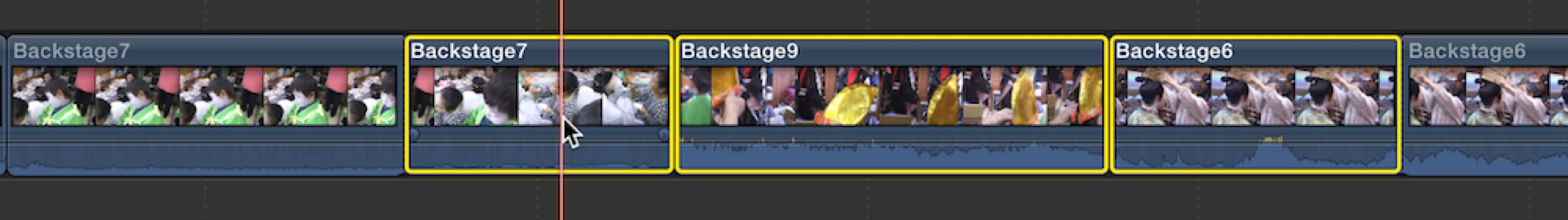 But what if I wanted to replace a section of the video, not just one shot, but from the middle of one shot to the middle of three shots away? There is a pretty simple way to do this. First blade the clips where you want the replacement section to go and then select the the clips in that section as in this image.