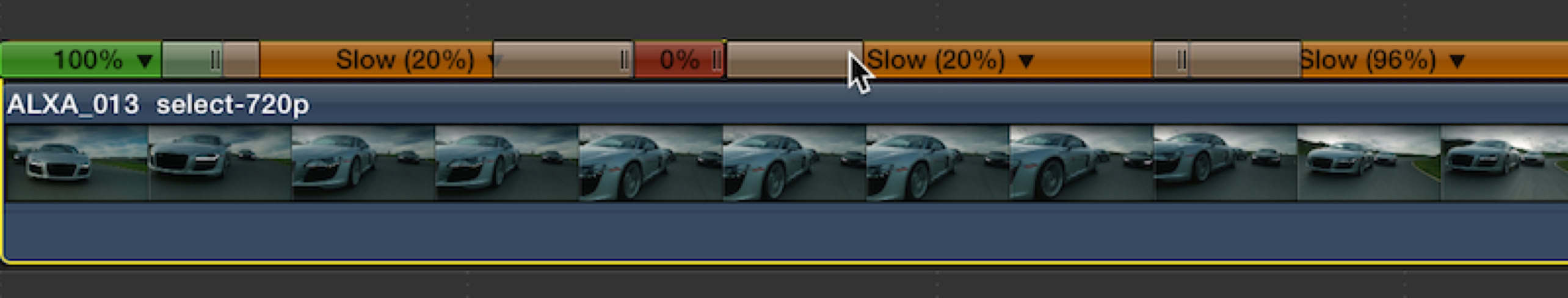 Applying Speed Transitions to a clip will create smooth changes of speed from one speed to another. The length of the transition is just like a speed segment in an FCP project and is fully adjustable.