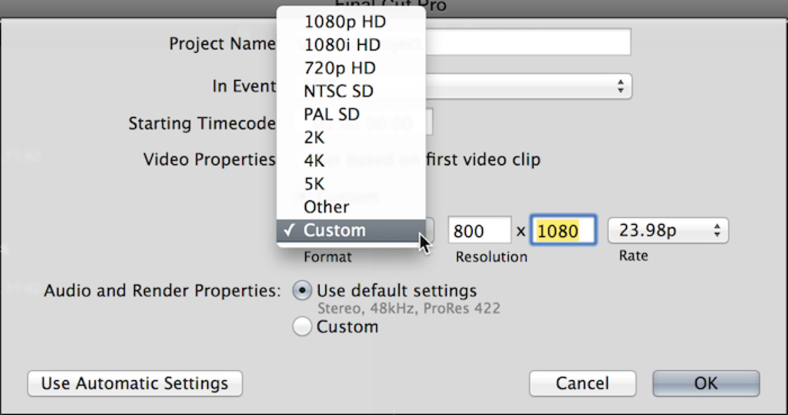 An important new feature of FCPX 10.1 is the ability to create projects of custom sizes, 1920x720 for the super widescreen or 800x1080 for a tall video display. When you make a new project, select Custom.