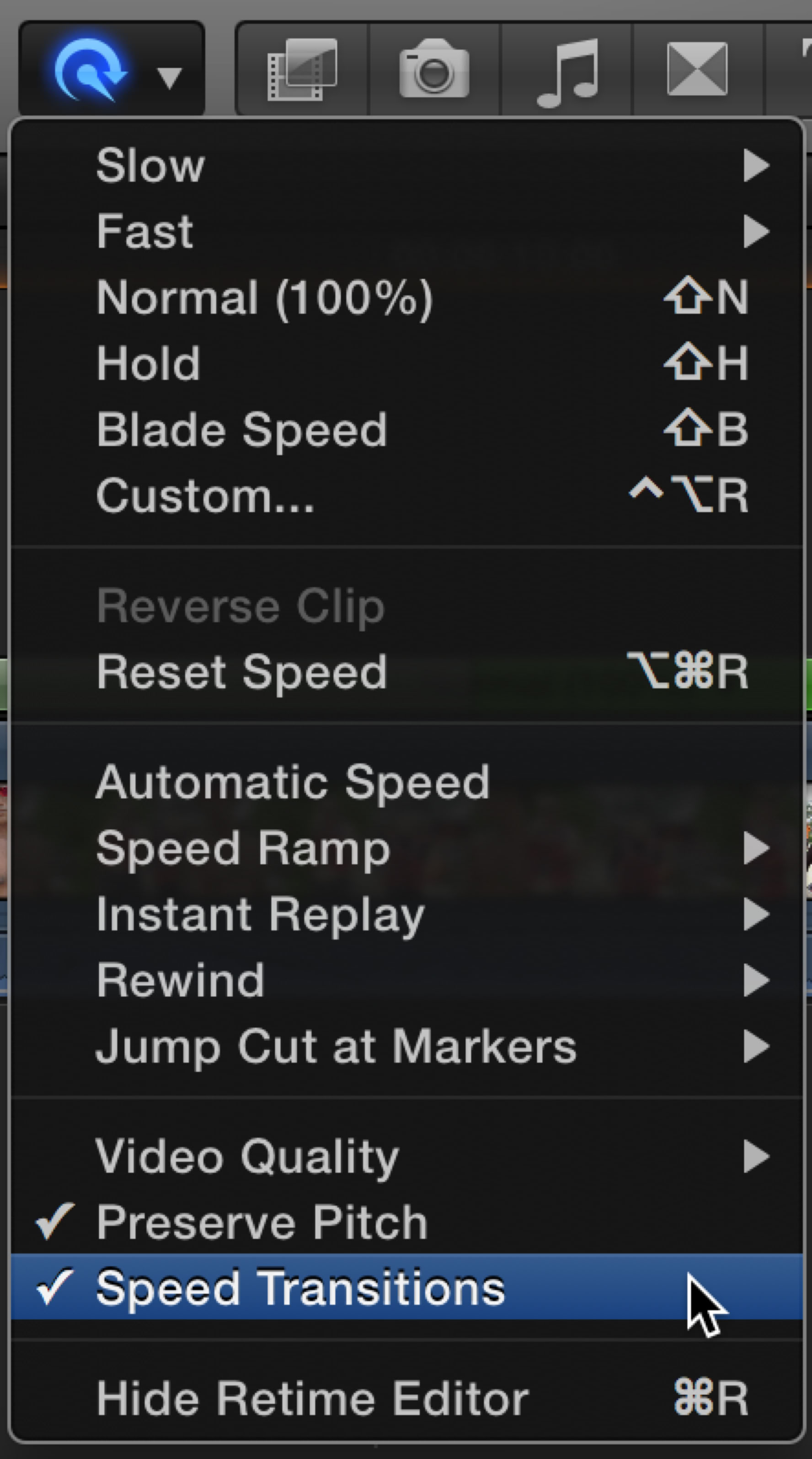 Another retiming feature that has been added is Speed Transitions, which can be evoked from the Retiming menu.