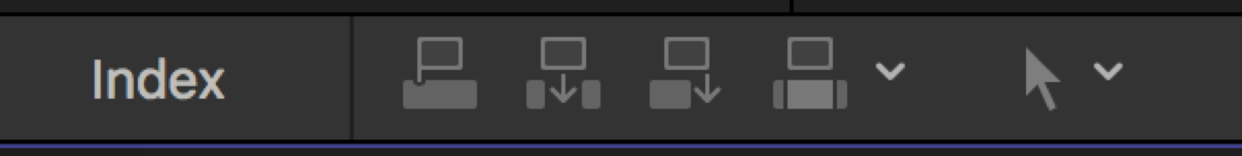 The Toolbar itself now has a miscellany of items, some of which used to be at the bottom of the screen, the first being the Index button for the Timeline (Shift-Command-2), which used to be in the bottom left and is now on the left of the Toolbar along with the edit selection popups and the Tools popup remain where they were. The one exception is that the Overwrite edit function has been added to the edit functions. Also the icons for video only and audio only have changed. The Favorites, Unrated, and Rejected buttons have been removed completely. The functions are still available in the Mark menu and with the shortcuts, F, U, and Delete.