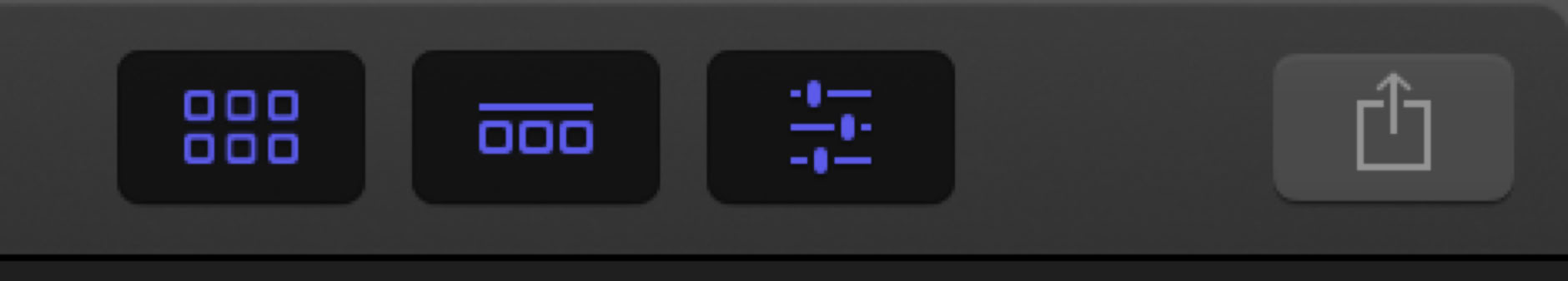 The first button on the right side opens and closes the Sidebar and the Browser (Control-Command-1).The middle button opens and closes the Timeline pane (Control-Command-2), while the third button is the Inspector button, still Command-4. These three are the primary controls for Workspaces, which we’ll look at on page 3. To the right of the Inspector is the Share popup menu.