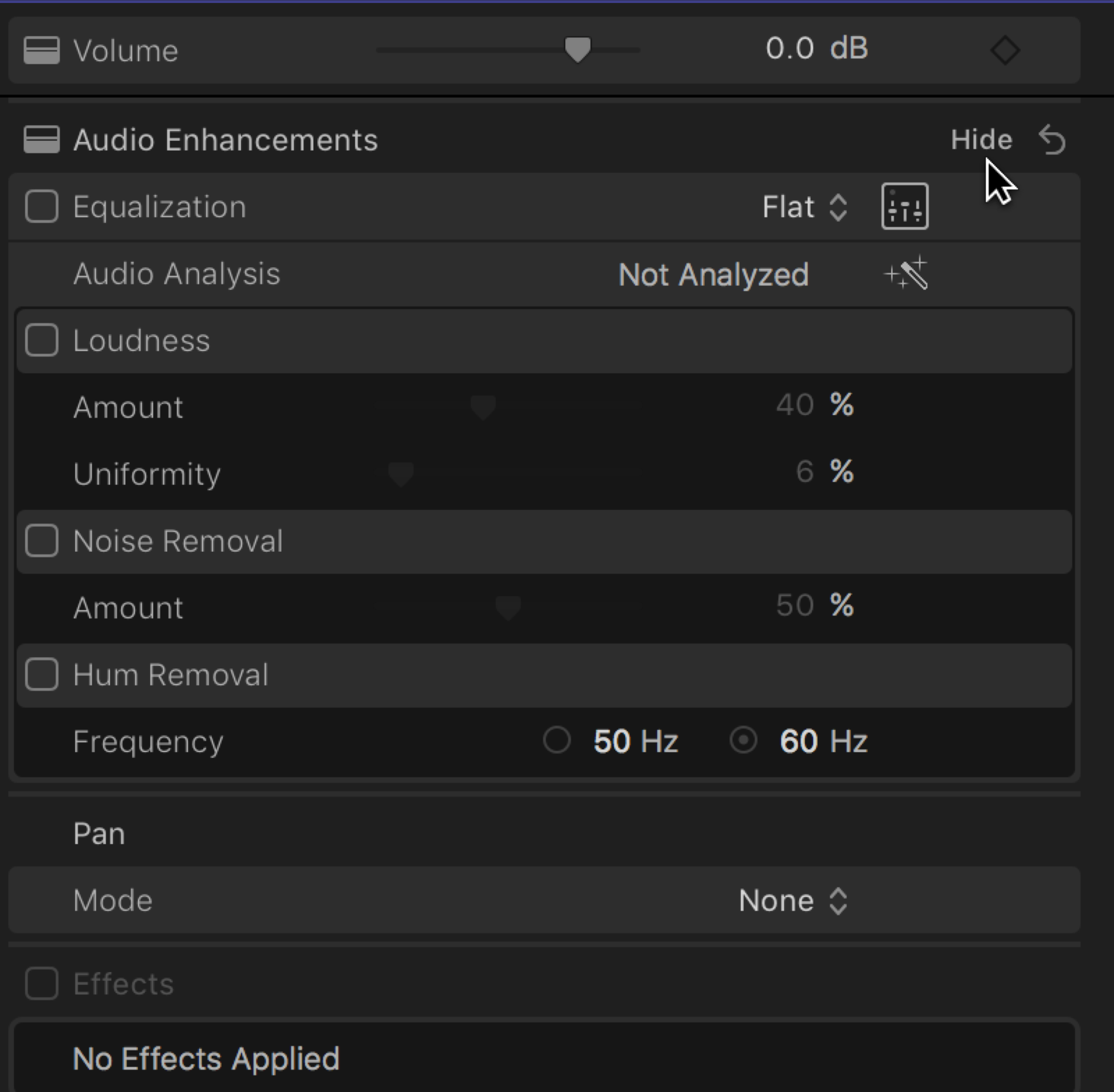 The Audio inspector has been modified so the enhancements are built into the pane and revealed. The Show button will open an EQ and Enhancements section. The shortcut Command-8 doesn’t do anything anymore.