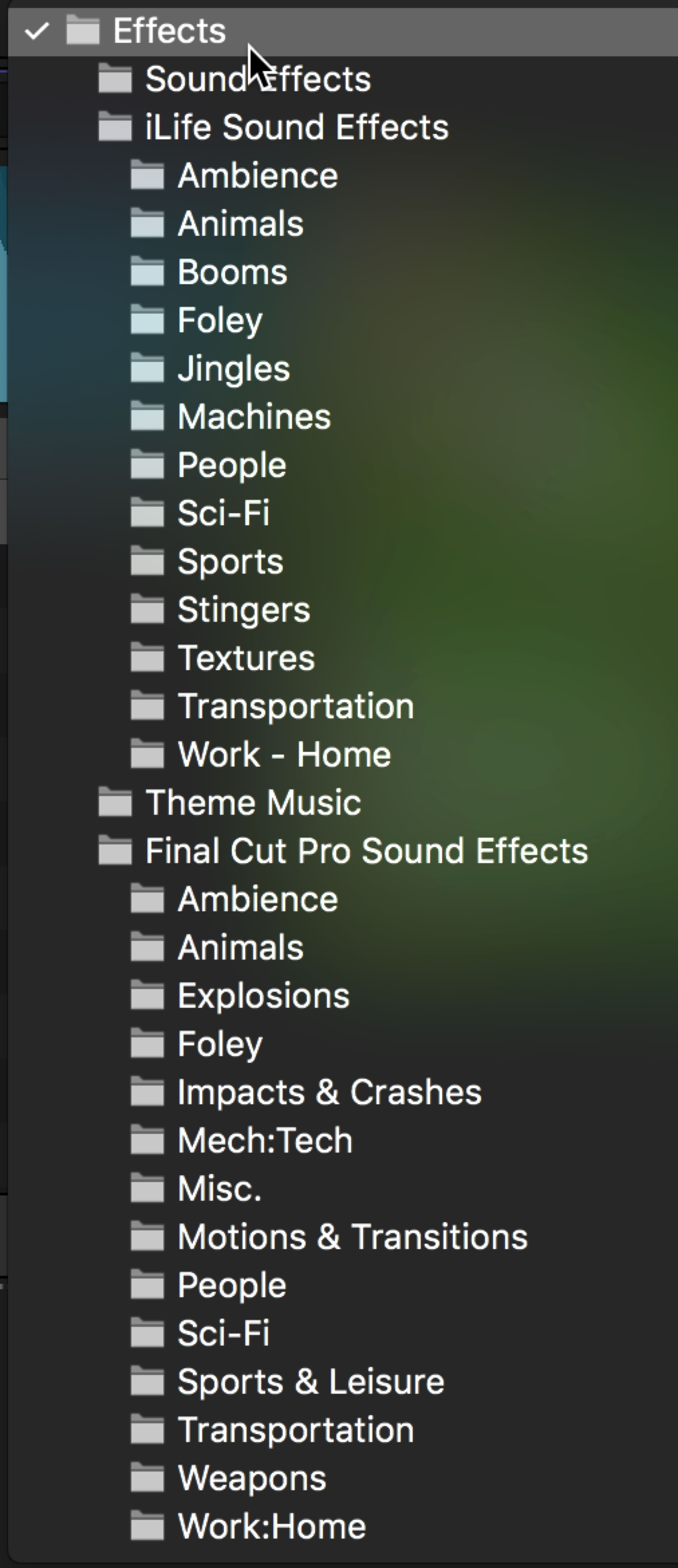 The iLife and iMovie content is available from the menu in the upper right of the Audio Browser. You can’t however drag additional folders into the Browser as you could in previous versions.