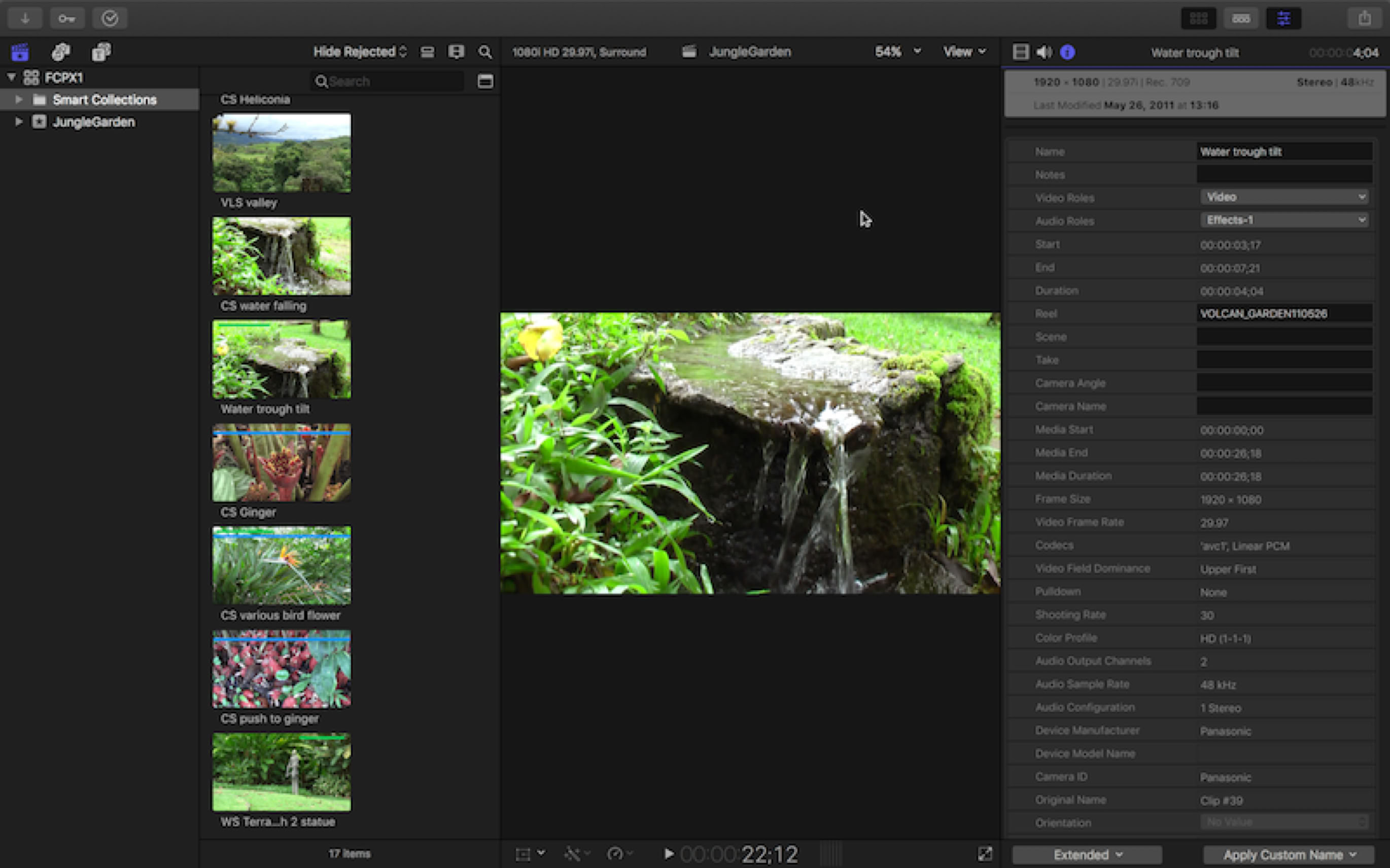 Another really important feature of the new interface is Workspaces that can be customized and saved. There are three basic workspaces: the original Default layout (Command-0 zero); an Organize layout, with no Timeline, a long Browser, central Viewer, and full length Inspector (Shift-Control-1); and Color & Effects (Shift-Control-2), which has scopes open, Viewer, Inspector, Timeline and Effects Browser.