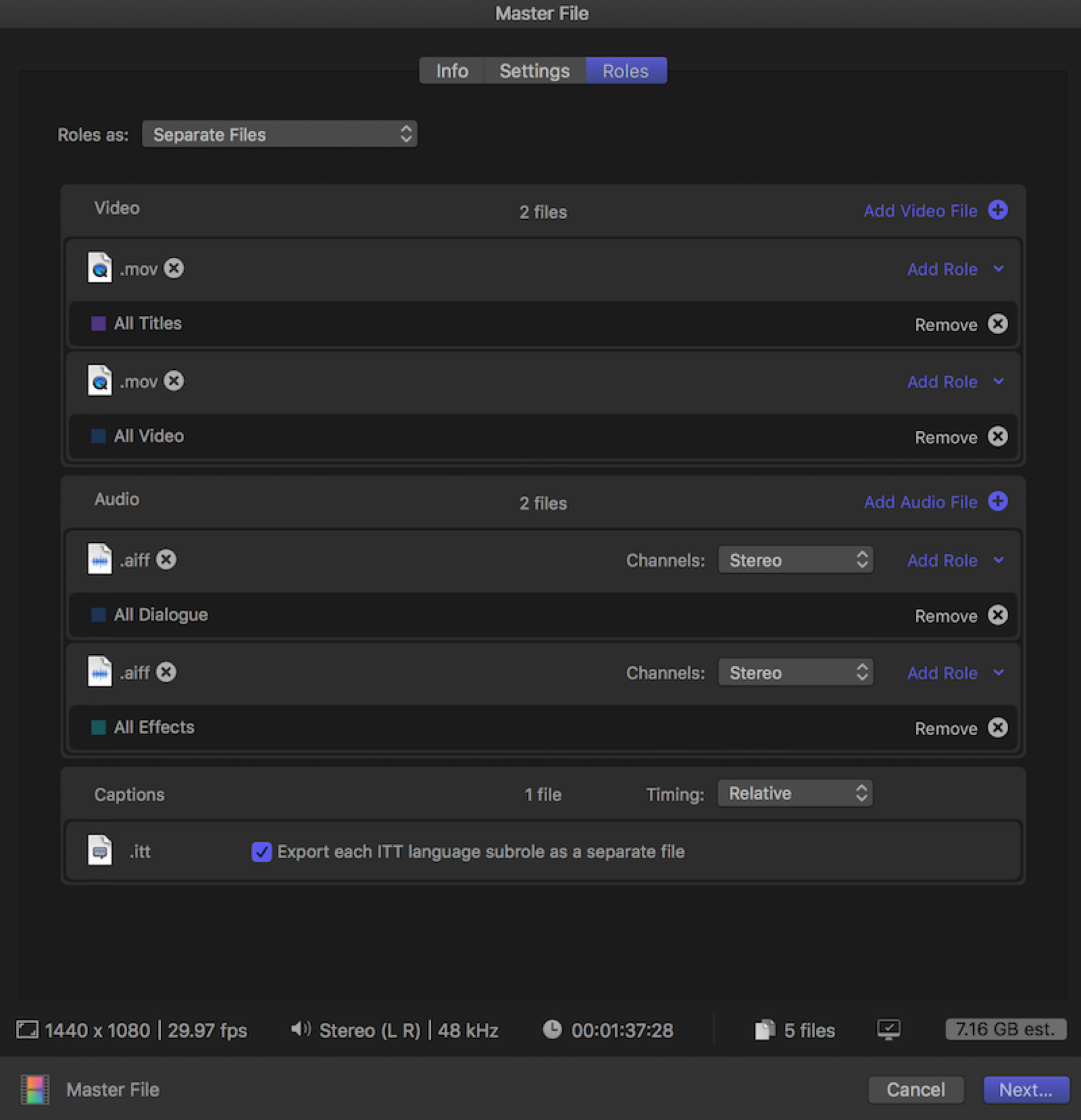 The Roles tab isn’t simply for Captions, but add new capabilities to what was previous possible with Role exporting. You can select and audio channel format for a track, combine Roles in a track, remove Roles from a track, and of course add Captions. You can also select the Caption language. You can export Captions as part of the video or as separate files in the two supported standard formats. You can also save Role presets to speed your workflow.