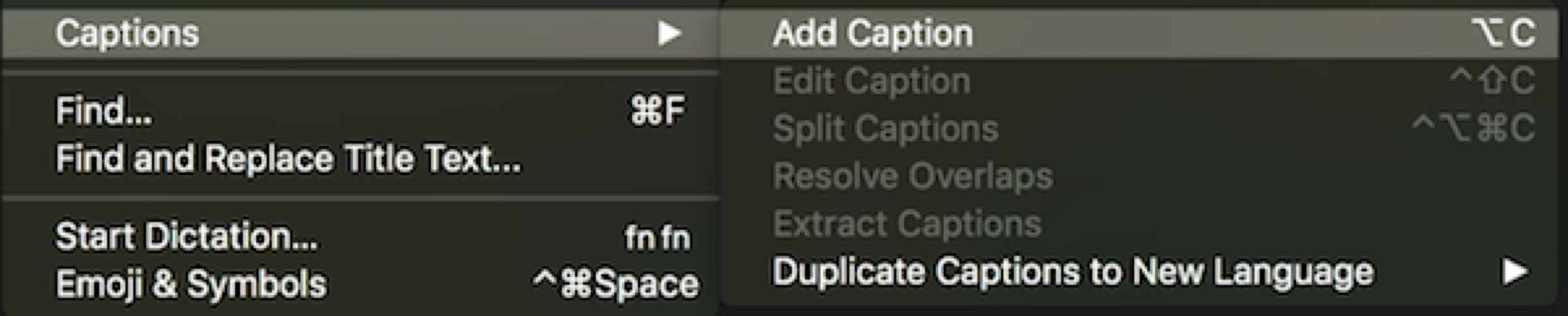 Captions can also be created in FCP and Compressor In FCP a new caption can be added from the Edit menu, or called up with the shortcut Option-C, which brings up the Captions Editor. Use Control-Option-C if the Captions editor is already open.