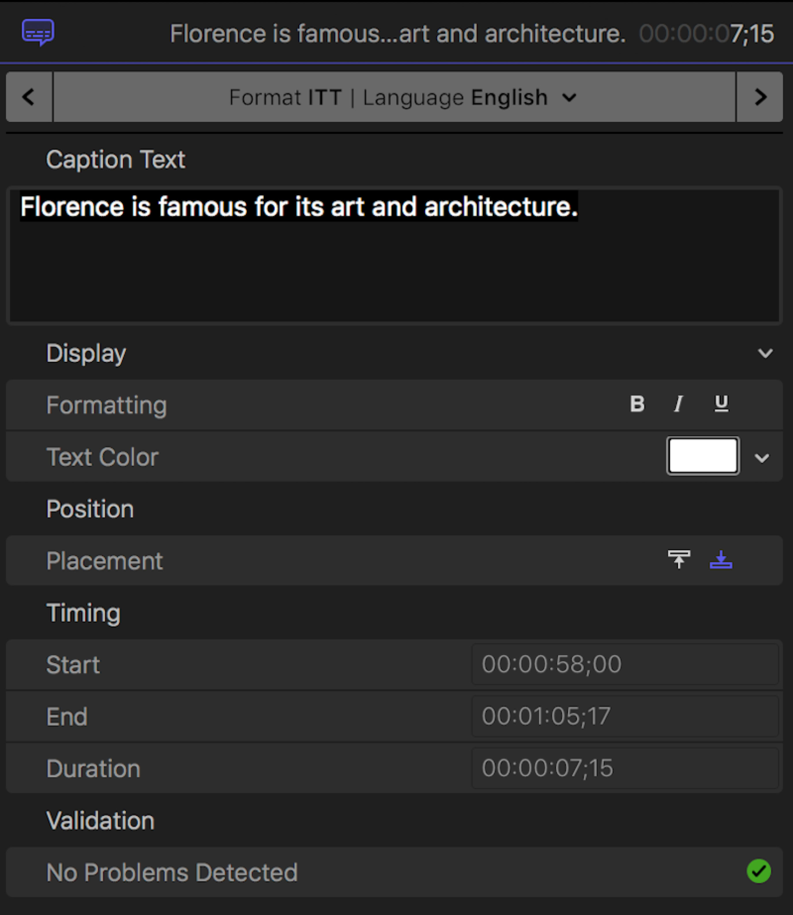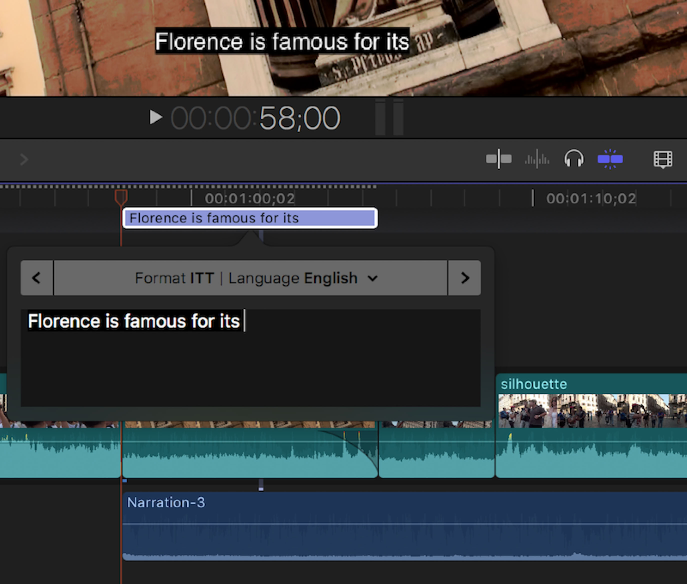In FCP Captions can be creating in a great many languages and appear in the Timeline as separate Captions having a separate language subrole.You can create a language by selecting the Captions and using Edit>Captions>Duplicate Captions to New Language. You choose which Captions and language is visible in the Timeline Index.You can also hide captions. The Index changes only effect the display in the application and not any export functions.The Index will also display the caption content and validate it.Captions with validation problems like overlaps will appear in red in the Timeline.You can select in the Index to only display Captions with errors Validation confirms the text is correctly formatted, without an incorrect characters, and without overlapping. Because of FCP’s trackless architecture, Captions can overlap in the Timeline. The overlap can be fixed automatically from the Edit>Captions menu. You can also split Captions if they’re too long from the Captions menu or with Control-Option-Command-C. There is also a Join Captions command if you want to combine Captions.Splits divide the Caption in half, regardless of playhead and Skimmer position, splitting the text at line breaks.