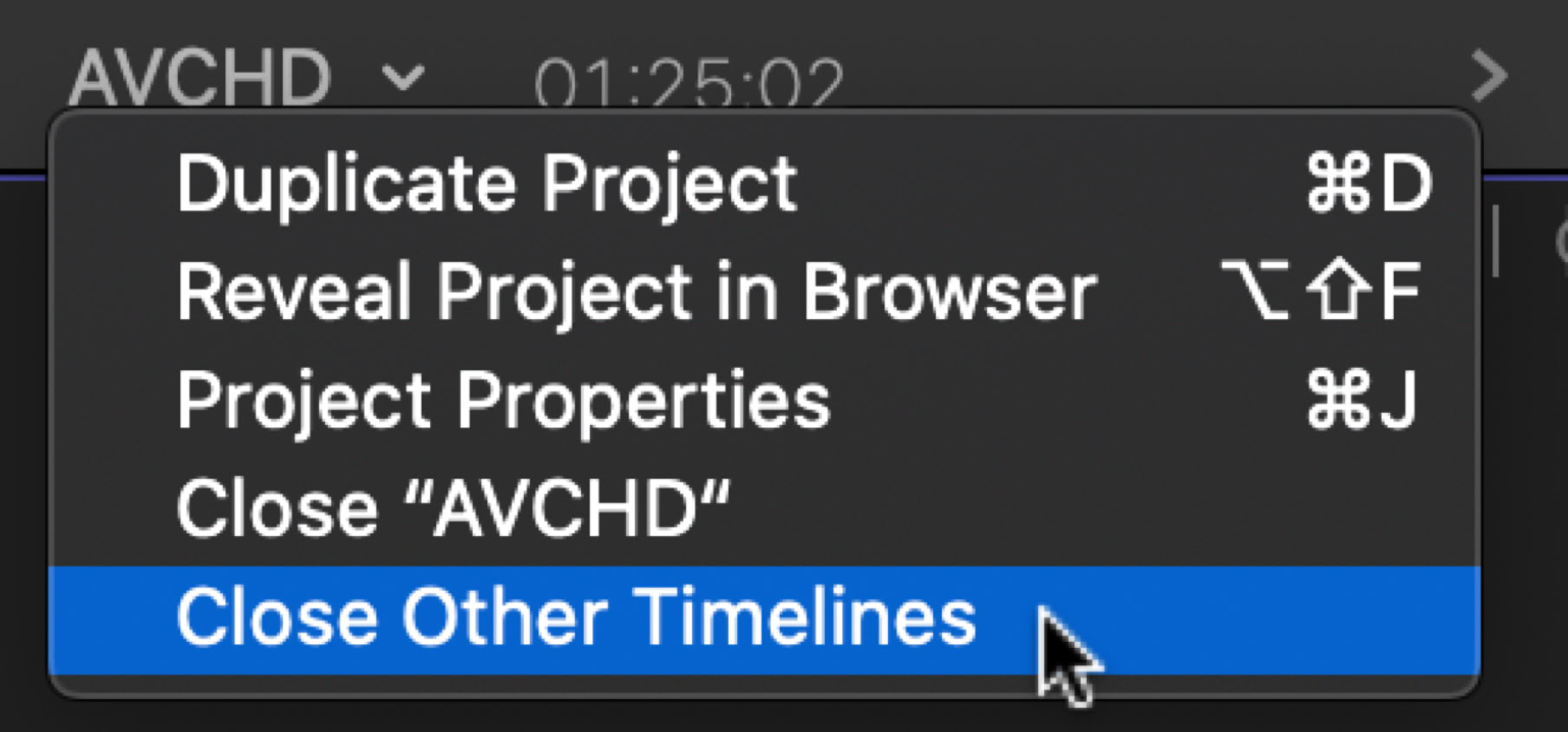 A really useful new feature in the project timeline is the ability to close the open project or to close other open projects.In addition to the backward and forward buttons that access menus you can use a popup that lets you access multiple options, including close other projects, and close the open project. Using them both, will clear the Timeline pane of all content. Not a bad idea if you’re shutting down a complex project and don’t need to have it reload when you relaunch the application.