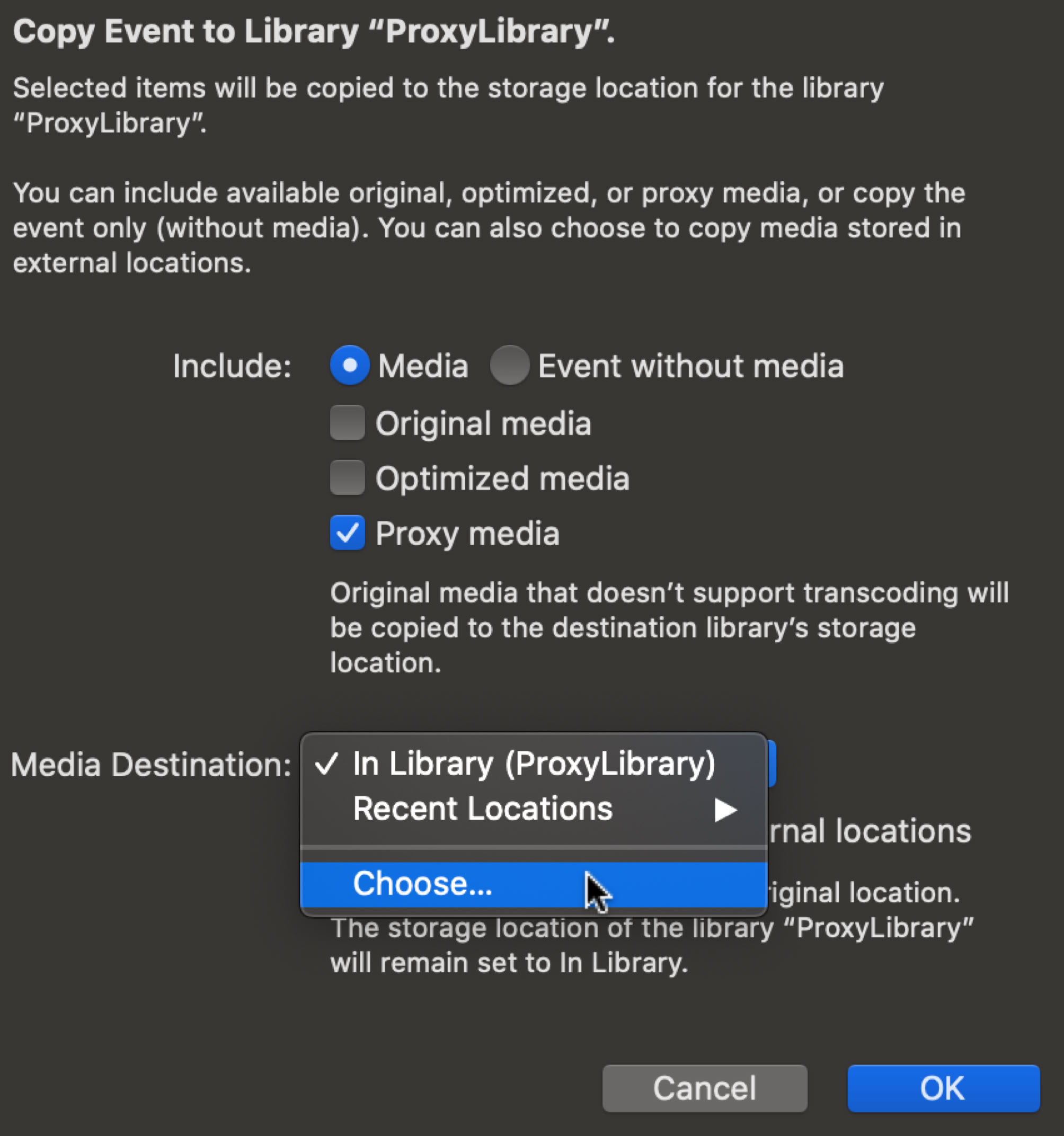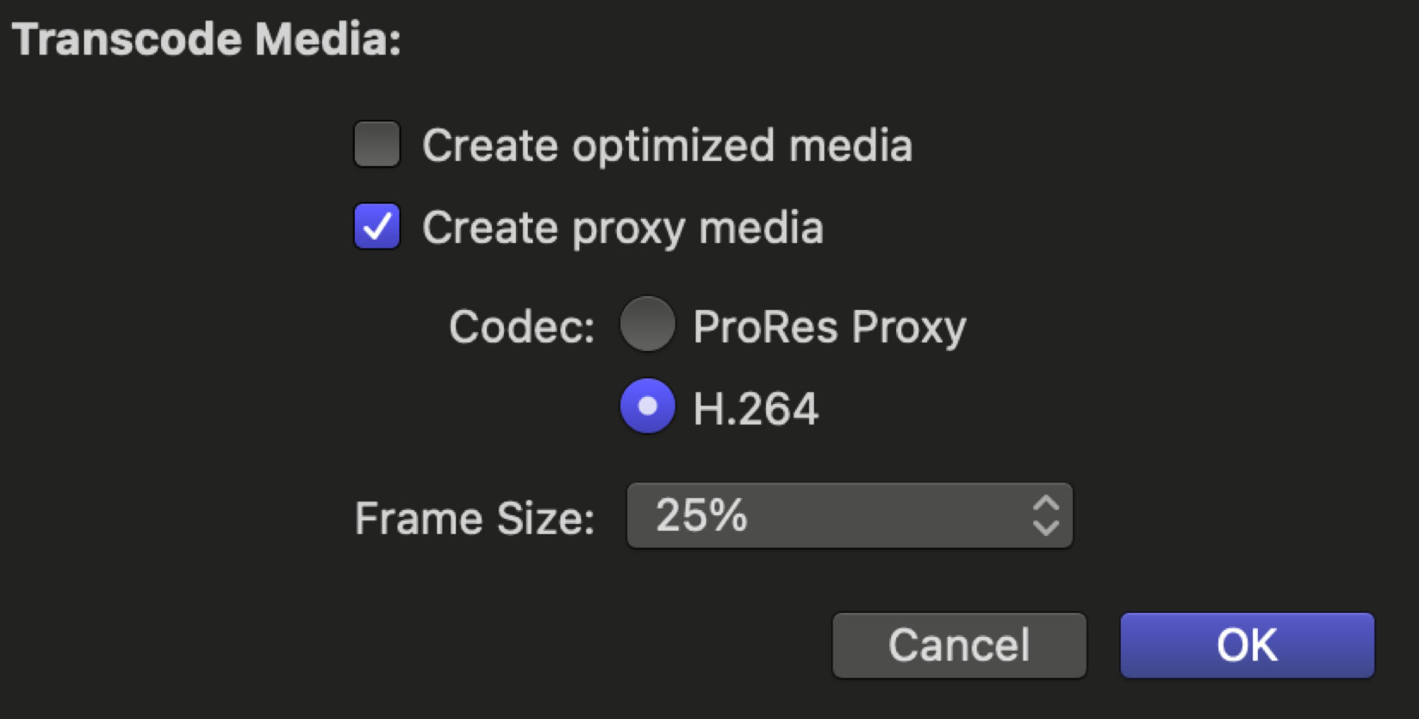 You can choose between ProRes Proxy, better quality, but larger file, or H.264, smaller compressed files. You can also pick the size of proxy you want.