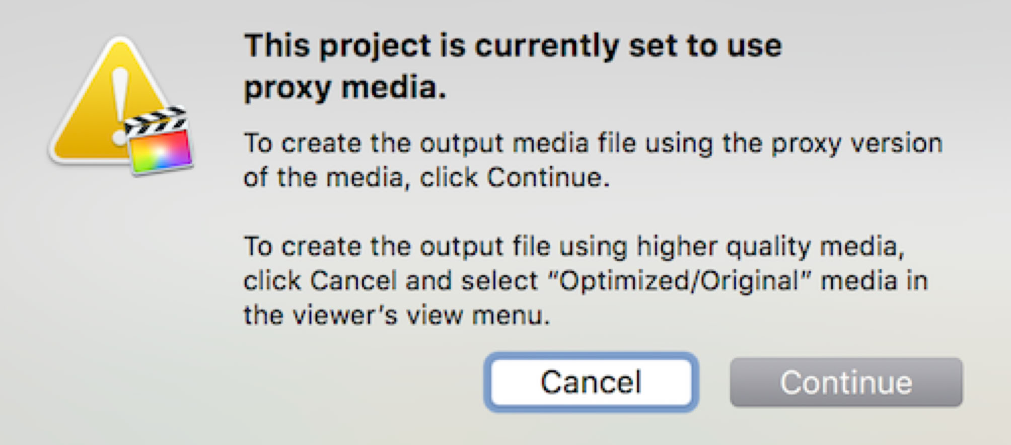 A new Sharing dialogue in FCP is very welcome. It warns when you’re exporting proxy media.