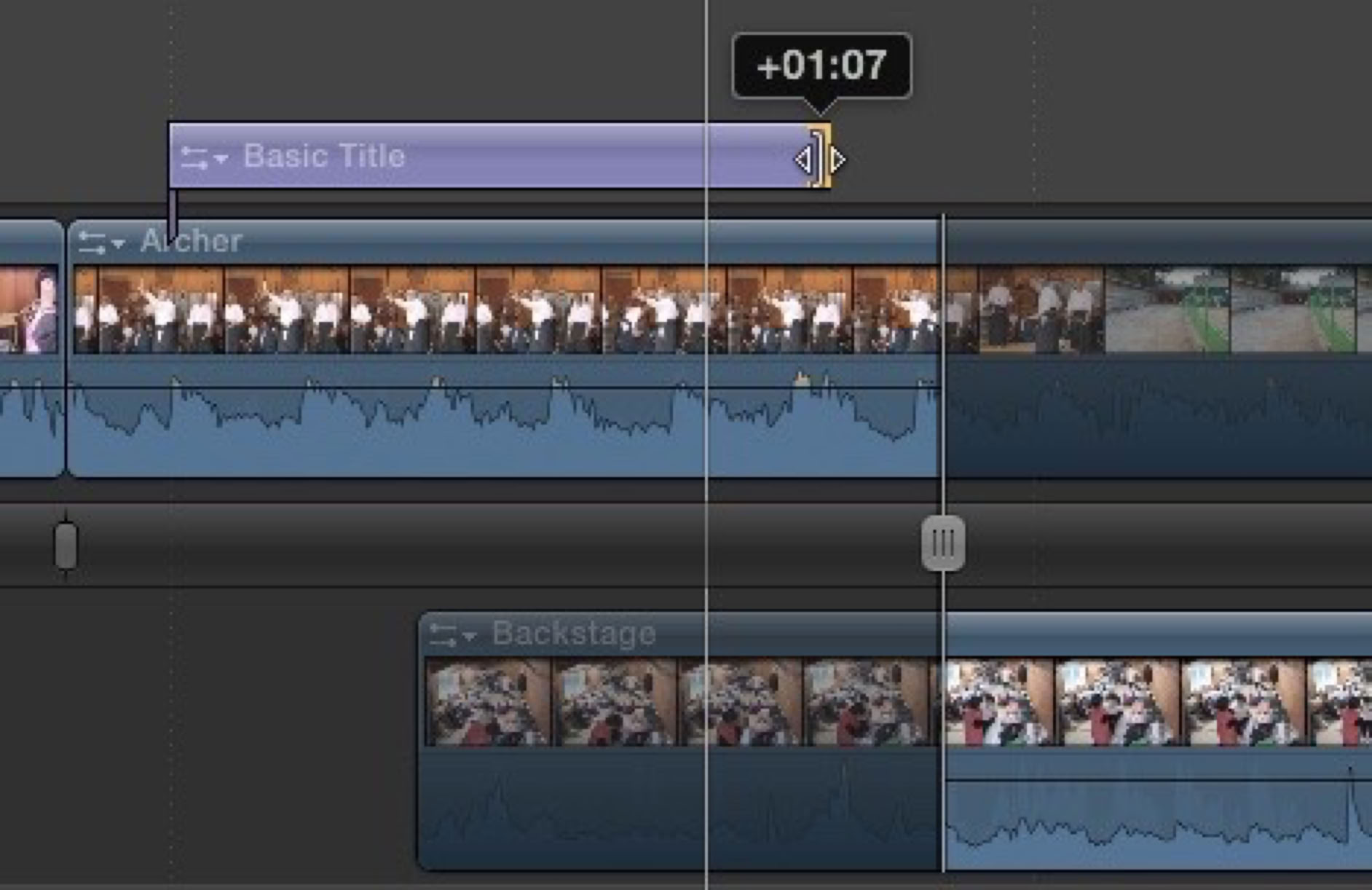 p154 This isn’t new in FCP, but it’s something I don’t think I made clear in the section on the Precision Editor, so let’s add a Note on p154 at the end of the lesson. The Precision Editor not only allows you to access the edit points in the Timeline, but you can access anything in the Timeline. For instance, with the Precision Editor open, if I want to adjust a connected Title, I can simply grab and drag the end, or I can pick it up and move it, without having to switch back to the Timeline.