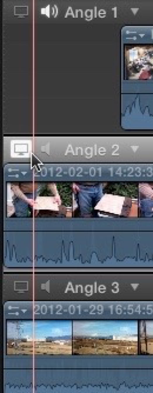 To check audio sync from multiple angles, turn on audio monitoring for a pair of angles or more and listen to the audio. You can toggle all the angles to a single angle by Option-clicking on one of the speakers at the head of the track.If there’s an echo they’re out of sync. Slip the clips in the lanes as needed to sync the audio precisely. You can move the clip in the lane with the Position tool, and remember you can nudge the clips left and right along the lanes with the