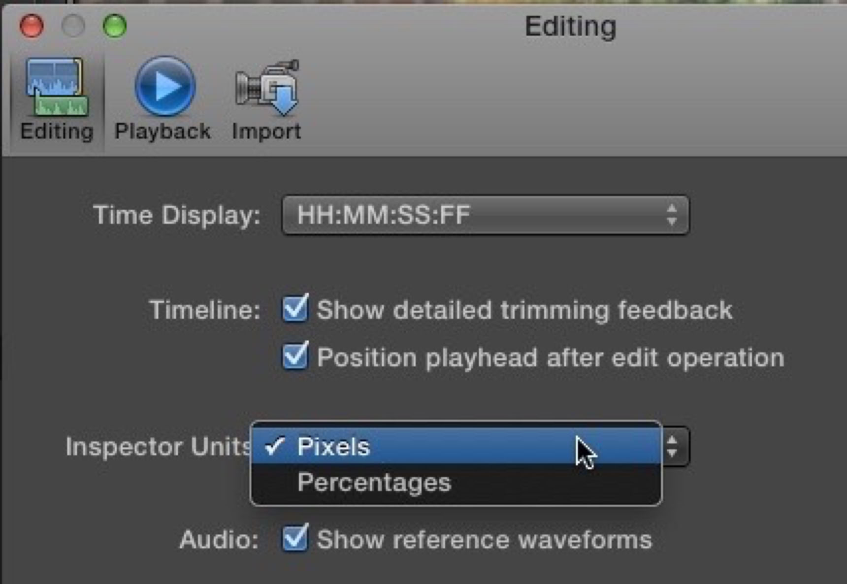 2. There is a new Editing preference to that allows you select how units are displayed in the Inspector, whether the Transform units are displayed as pixels or as percentages. Previously the display used some arcane reference unit that showed pixels as a ratio of the frame size. Now you have the choice of showing actual pixel values or percentages of the frame. Personally I like to use pixels as these are absolute values and are ones I’m used to from working in other graphics and editing applications.