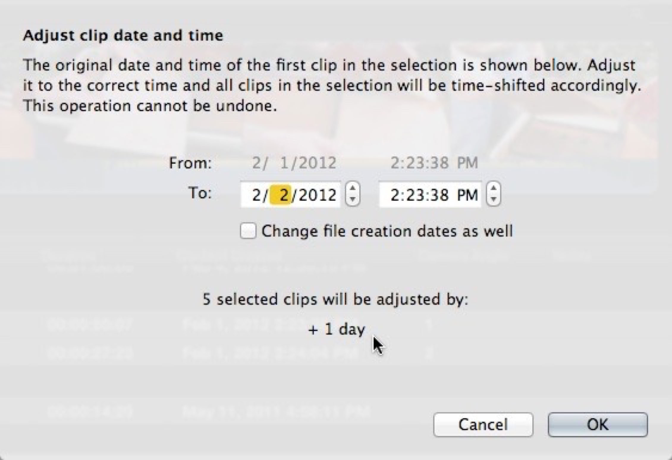 Notice two things in this dialog. This is not an absolute change for selected clips. By this I mean, you are not setting an exact date and time for all the selected clips. The other clips will change the amount of time, days or months or hours, relative to the amount you are changing the first clip. The other important thing to note is that this is not in the Undo queue. Once you change it, Command-Z will not help you. This is a destructive function as it’s changing the metadata on the QuickTime file on your computer.