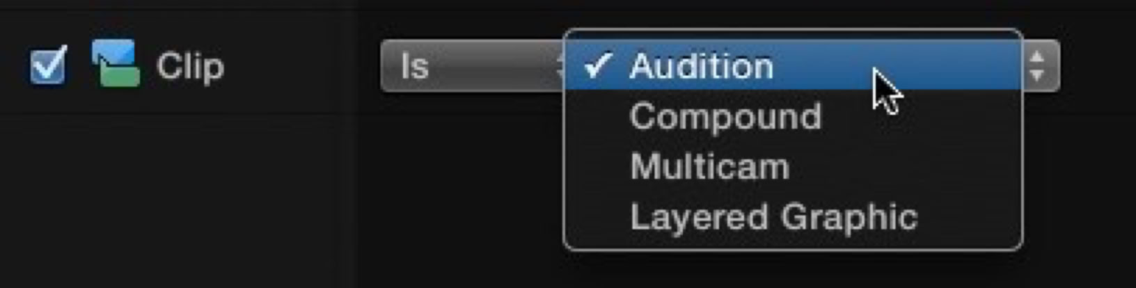In previous versions text added in Notes to Favorites and Rejects could not be located through a search. This has been corrected so all text is searchable using the Command-F function. There is also a new filter in the search command, to search for Clip Type, which lets you search for Audition, Compound, Multicam clips, and layered Photoshop files.