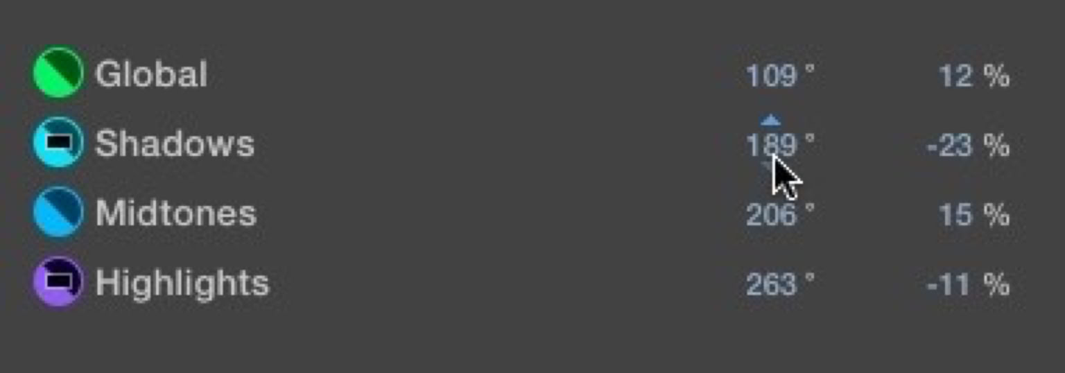 Many improvements have been made to the Color Board. The first is that it can now be used with greater precision. The numeric values in all three panels can be scrubbed with the scroll wheel of your mouse. In addition exact values can be entered in these boxes.