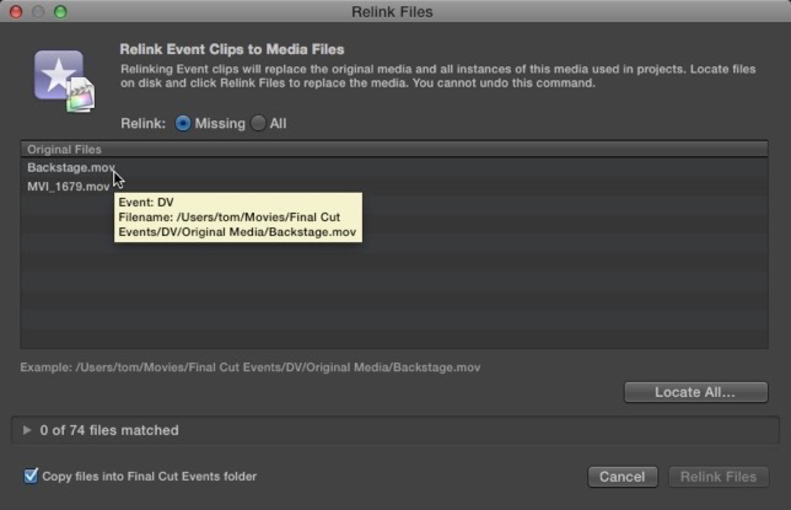 Notice the buttons at the top that let you select Missing clips or All clips. At the bottom of the dialog is the checkbox to copy the file to the event or not. This is similar to the import dialog. Use the button to Locate All, which takes you the navigation dialog. Find the file you want to relink to and press Choose. The file will move to the bottom half of the dialog. Files that need to be relinked that are in the same file-path will automatically be relinked. Other files in other locations can be selectively added using the dialog. Once you have all the files to relink loaded in the bottom portion of the window, click the Relink Files button. Relinking files in the Event Browser will also automatically relink the to missing files that are in projects.