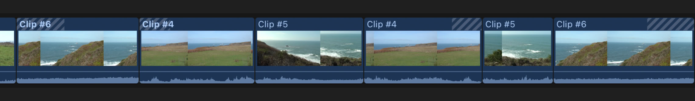 Duplicate ranges of clips, video or audio, appear with hash lines across the name portion of the clips in the Timeline.