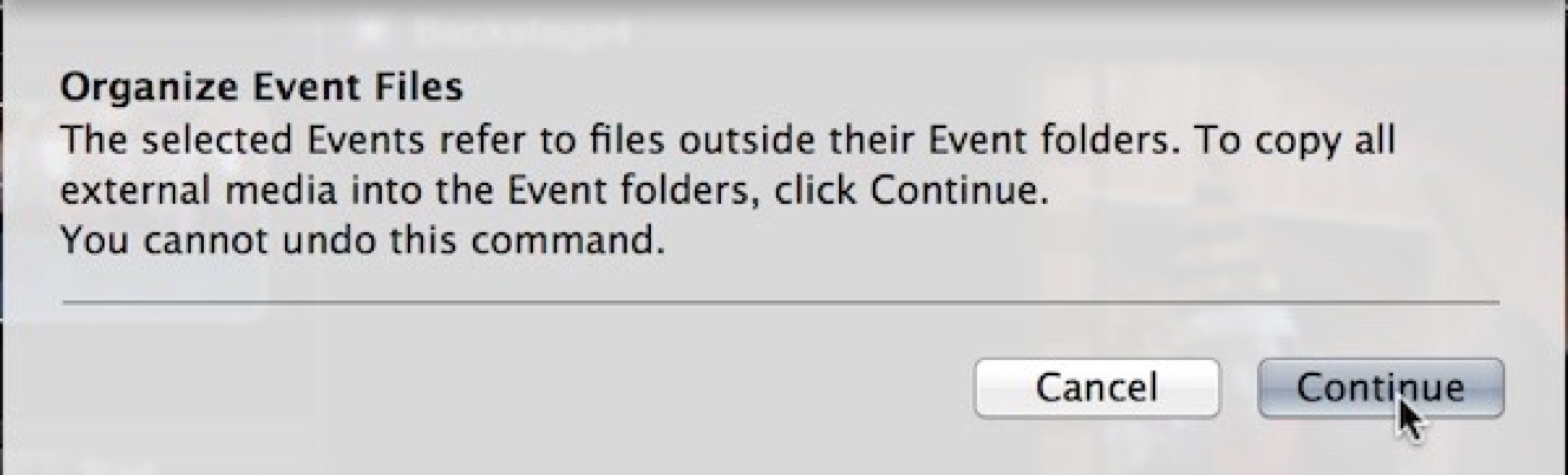 This will copy all the media into the events, replacing the aliases, making the events ready to archive. Make sure you have plenty of drive space as this can take big chunks of hard drive memory, depending on the format of your original media. When it’s done quickly check through the Original Media folder for each event to make sure the media is there.