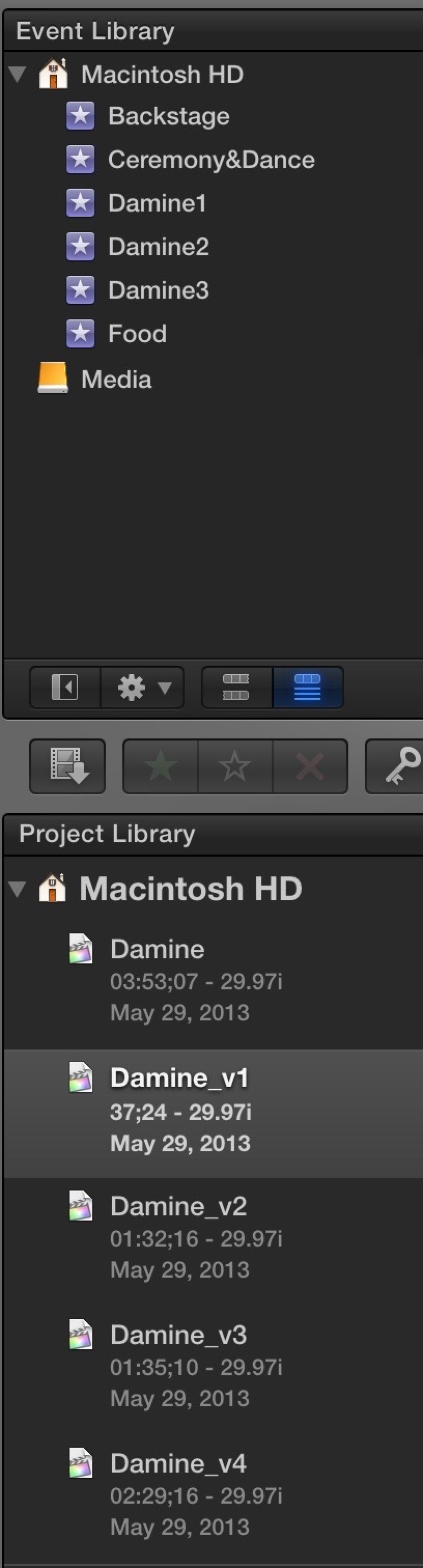 Damine_v1 is the oldest version, short and only uses one event. Damine is the last version produced, the latest version and uses media from most of the events, but not all. To archive the production I would like to back up the media and all the projects and versions, not just the final version. But I wanted to backup just the clips used, not all the media.
