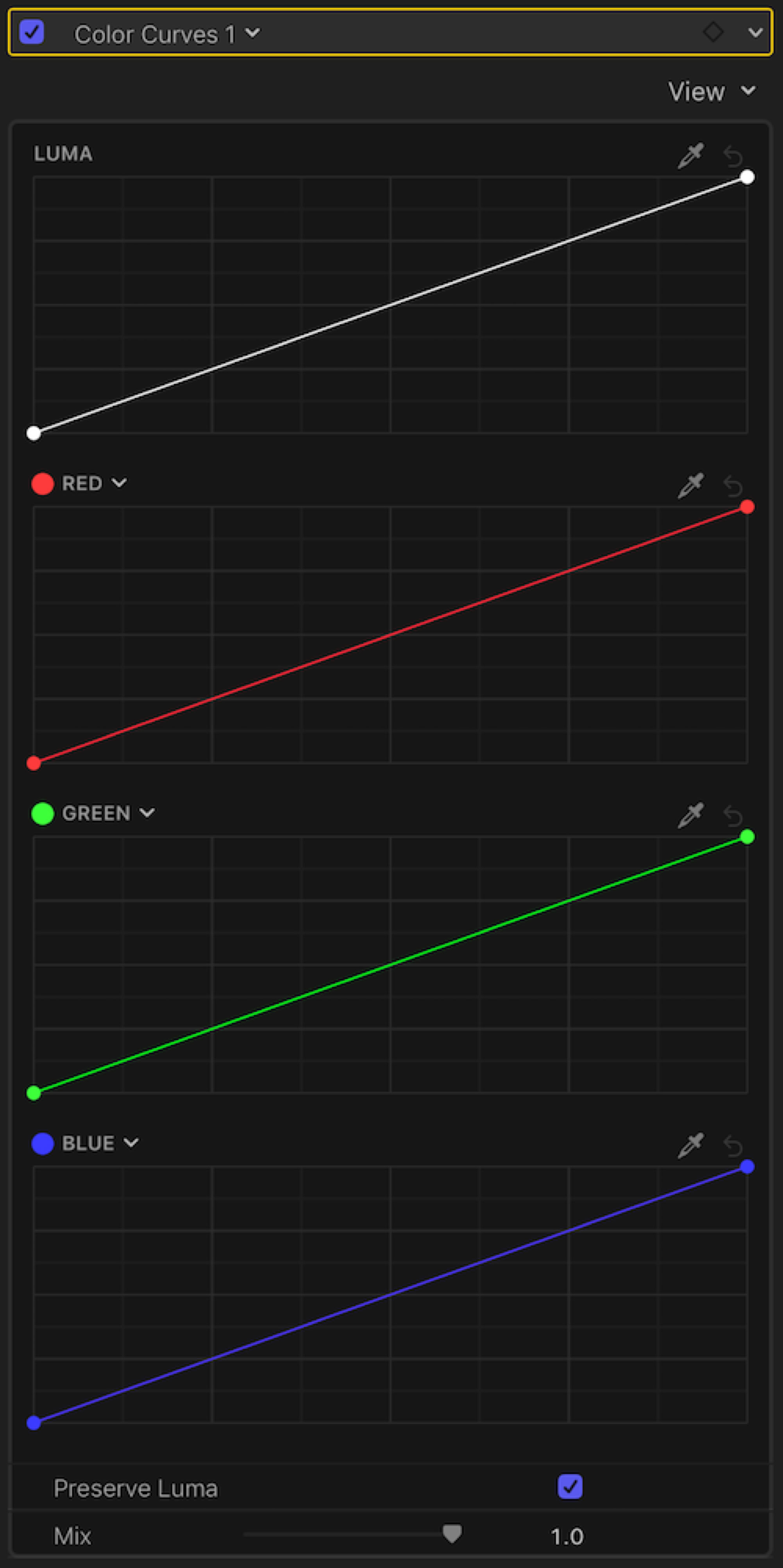Like the Color Wheels, the four curves can be collapsed into a single line with buttons to select between them. Also, notice the Mix slider and the important Preserve Luma checkbox, which is on by default.