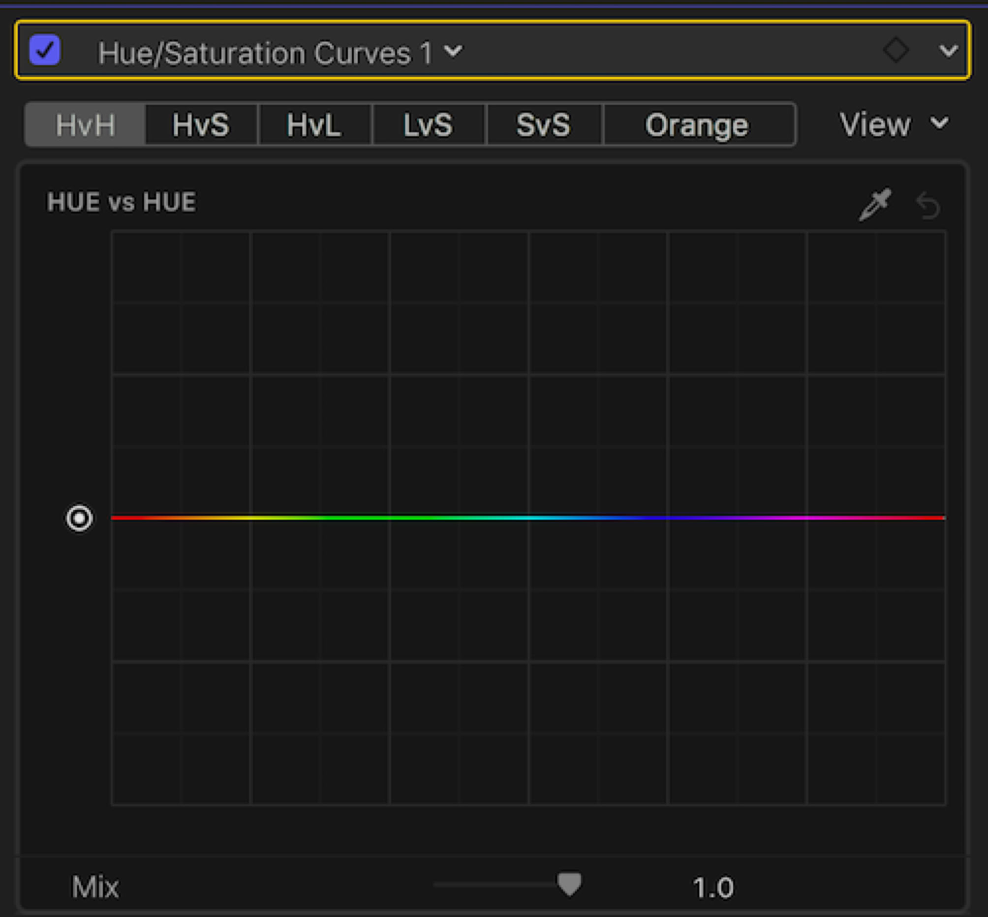 There are six Hue/Saturation Curves. These are very targeted selections with fine control. Most people use them for secondary color correction. Like the other advanced tools, these can either be seen independently in the full height Inspector, or collapsed into a single panel with buttons and the Mix slider at the bottom.