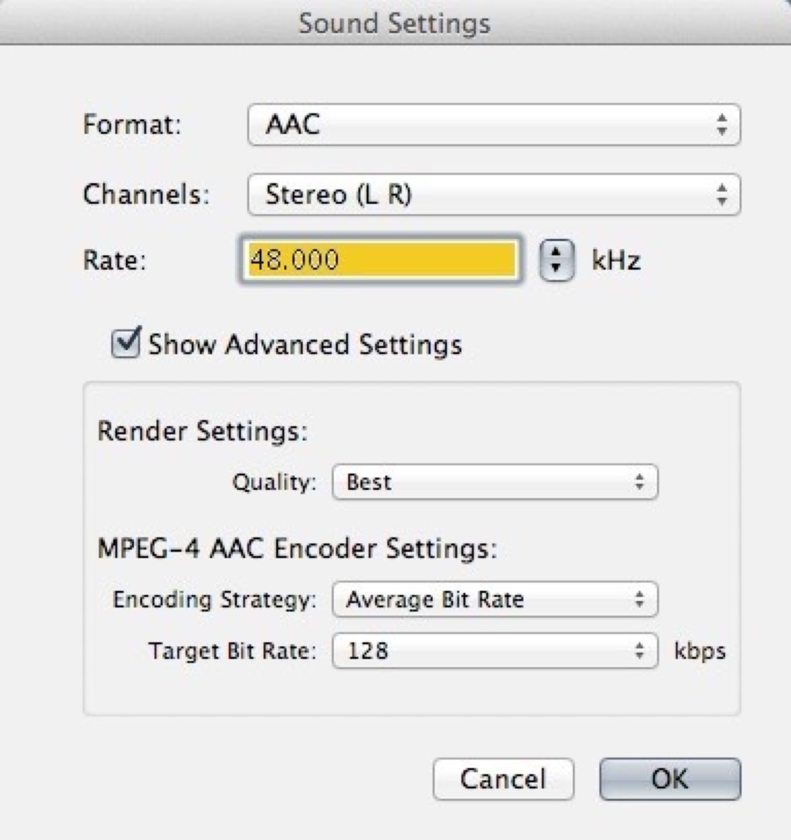 Set the Format to AAC. For many jobs, especially for video with speech only, setting the audio to Mono will work as well as Stereo and will save file size. For files with music set the Rate to 48K or 44.1, CD quality. For files with speech and natural sound only, set it down to 22K. This will also reduce the file size. When using AAC Mono at 22K, set the Target Bit Rate to 40. Otherwise, leave it at 128 for Stereo 48 or 44.1K.