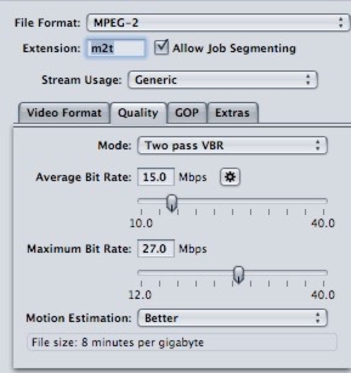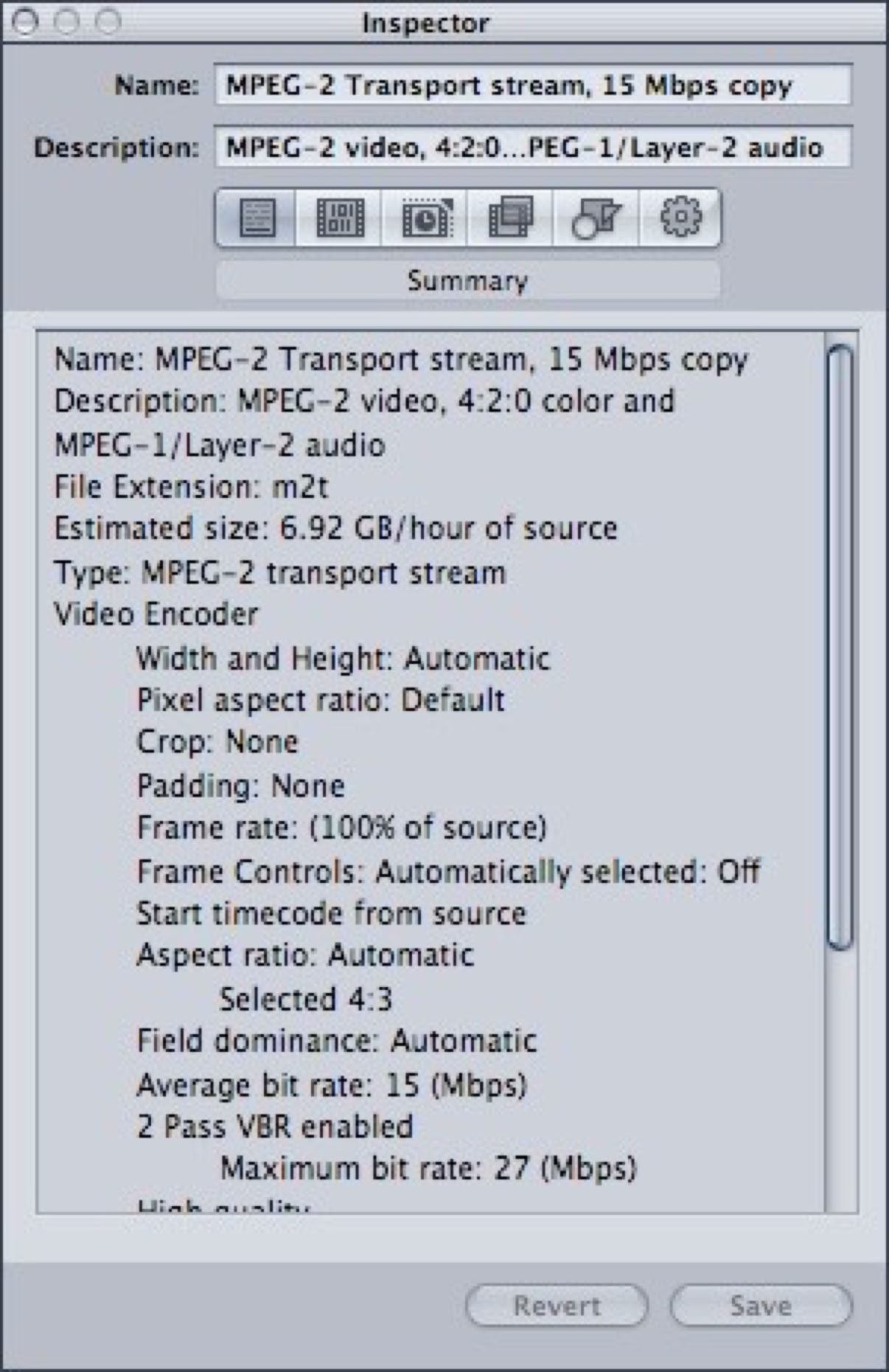 If the Video Format tab is set to automatic you can select in Quality in the Mode pop-up whether to encode in One Pass CBR (Constant Bit Rate), One Pass VBR (Variable Bit Rate) or Two Pass. There are also selections for one and two pass Best. Don’t use Best. It’s really slow and doesn’t do much for you, and in some instances actually isn’t as good as Better. If you don’t care how big the file is but want to encode quickly, use One Pass CBR. If size matters, use Two Pass VBR. With two pass you have separate sliders for average and maximum bit rate. Refer back to the Summary tab to see what differences your selection is making on the file size. (Ignore the display at the bottom.)