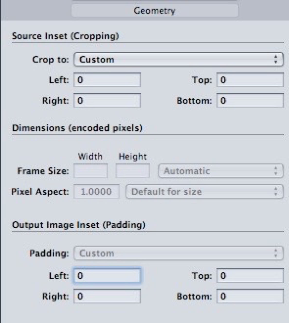 The Geometry tab allows you to create custom sizes for your media, non-standard shapes either by cropping or by padding the image. InGeometry you can set a standard or custom size or set a percentage of the source file.